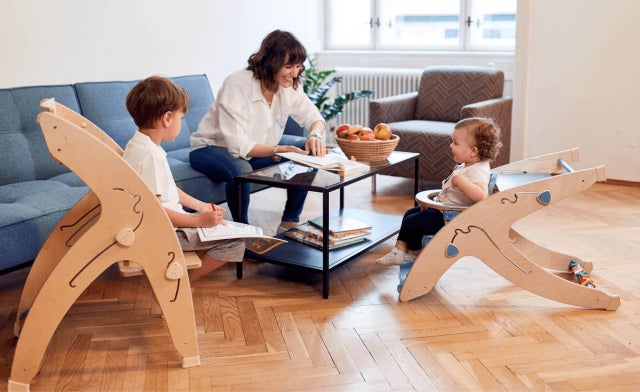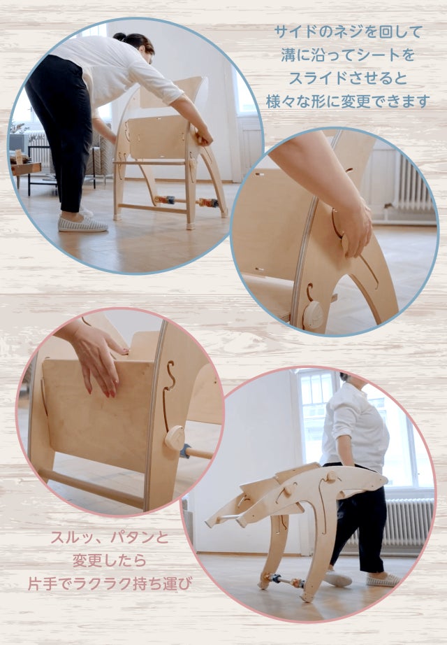 側面の丸いネジを緩め、2つの木製パネルを希望の位置にスライドさせることで簡単に「子供用テーブル」「小さな階段」または「ロッキングチェア」などに変更できます。