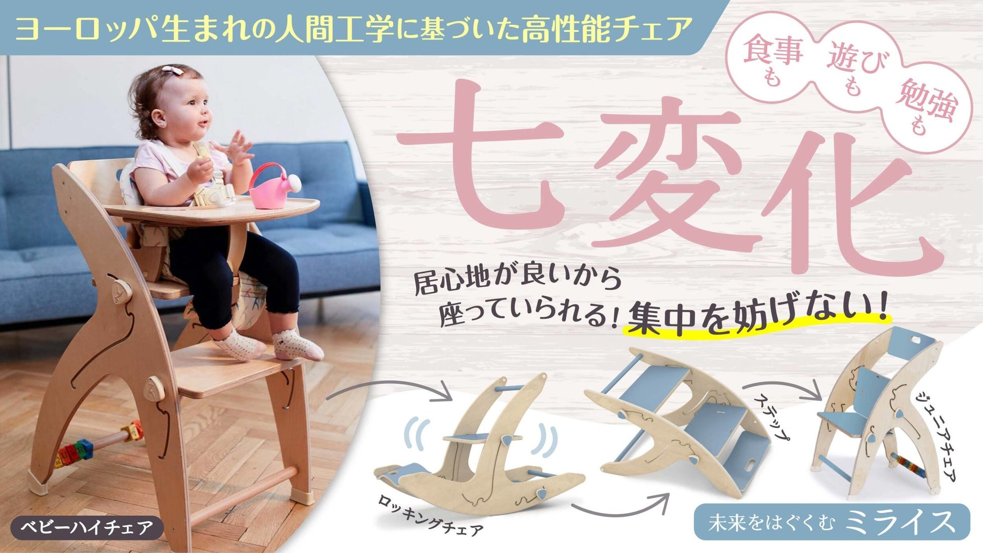 【日本初登場の七変化する多機能チェア】今までにない斬新なスタイルの「ミライス」は、子どもの未来(ミラい)のために好奇心と想像力を育む椅子(イス)です。Makuake(マクアケ)で先行予約販売スタート。