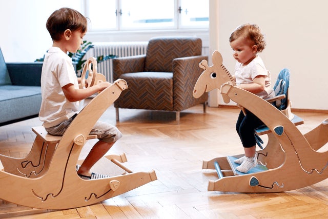 ミライスは、ハイチェアやローチェアだけでなく、子どもたちの想像力を掻き立てる木馬に変身します。