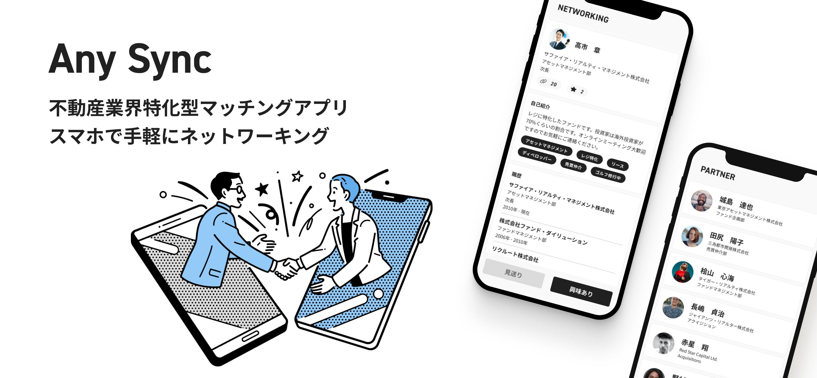 株式会社Any Sync(本社:東京都港区、代表取締役:崎原盛裕)は、事業用不動産取引に携わるビジネスパーソンを対象としたマッチングアプリ「Any Sync」をiOS、Androidアプリにてリリースしたことをお知らせ致します。
