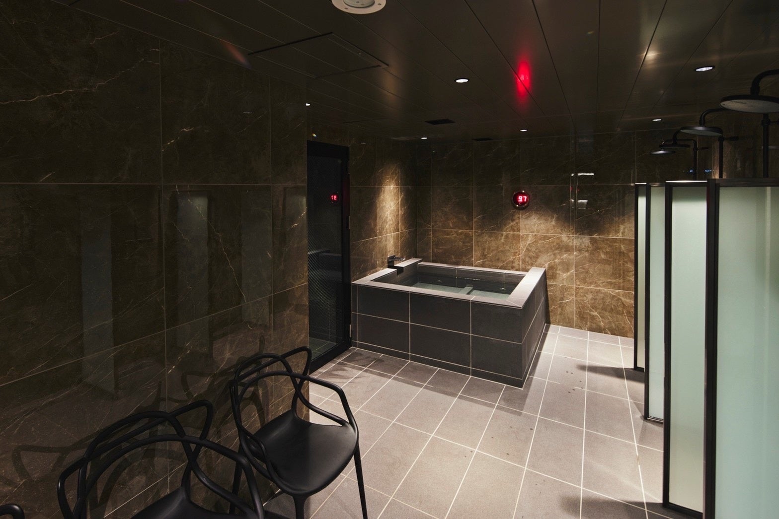 洗練され充実したトレーニングの後には、99°Cのアロマローリューサウナと9°Cの水風呂でお身体を癒してください。