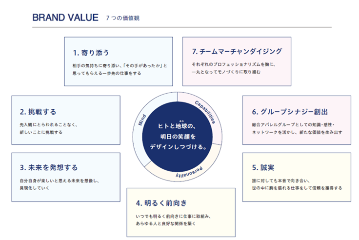 これまで培ってきたお客様に寄り添ったソリューション提案力と、総合アパレルグループとしてのノウハウ、チームマーチャンダイジングを活かしてお客様や世の中に新しい価値を提案することにより、笑顔を生み出しつづけていきたいという想いが込められています。パーパスとそれを構成する7つの価値観であるバリューは社員の対話と思考、お客様との関係性を通じ、私たちの内側から抽出されてつくられました。