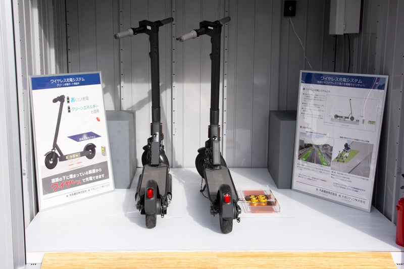 同所にて、大成建設株式会社と共同で、電動キックボード「mobby」に対して、電界結合手法を用いたワイヤレス給電に関する実証実験を行っております。本実証実験は株式会社mobby rideにより提供される電動キックボードの車体に、大成建設グループが研究・開発を進めている再生可能エネルギーを使った「グリーン充電ポート」より、床からのワイヤレス給電を使って充電するものとなっています。