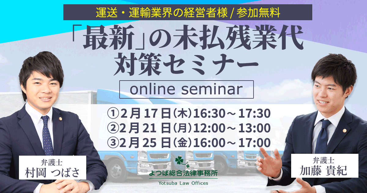 この度、運送会社様向けに、「最新」の未払残業代対策というテーマで、無料オンラインセミナーを開催することなりました。