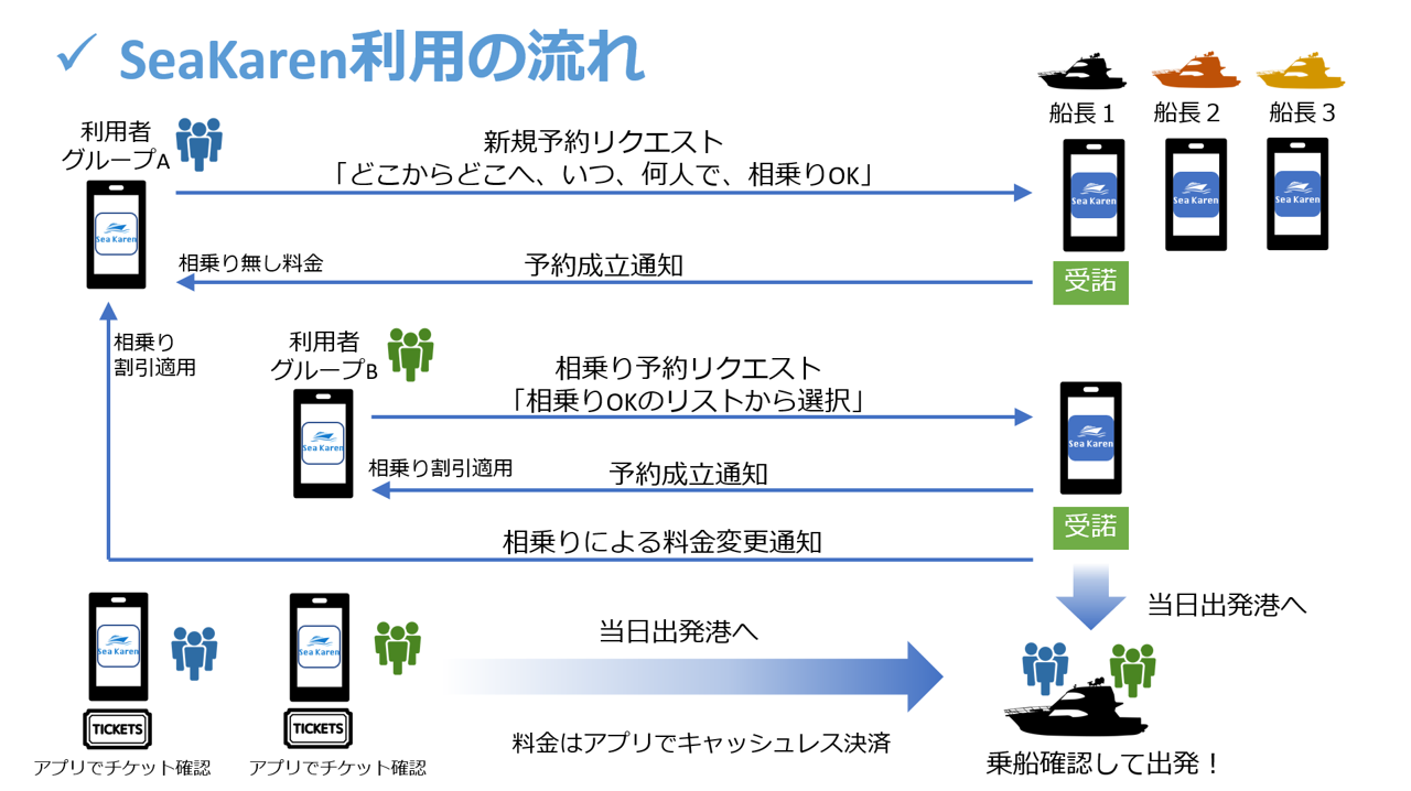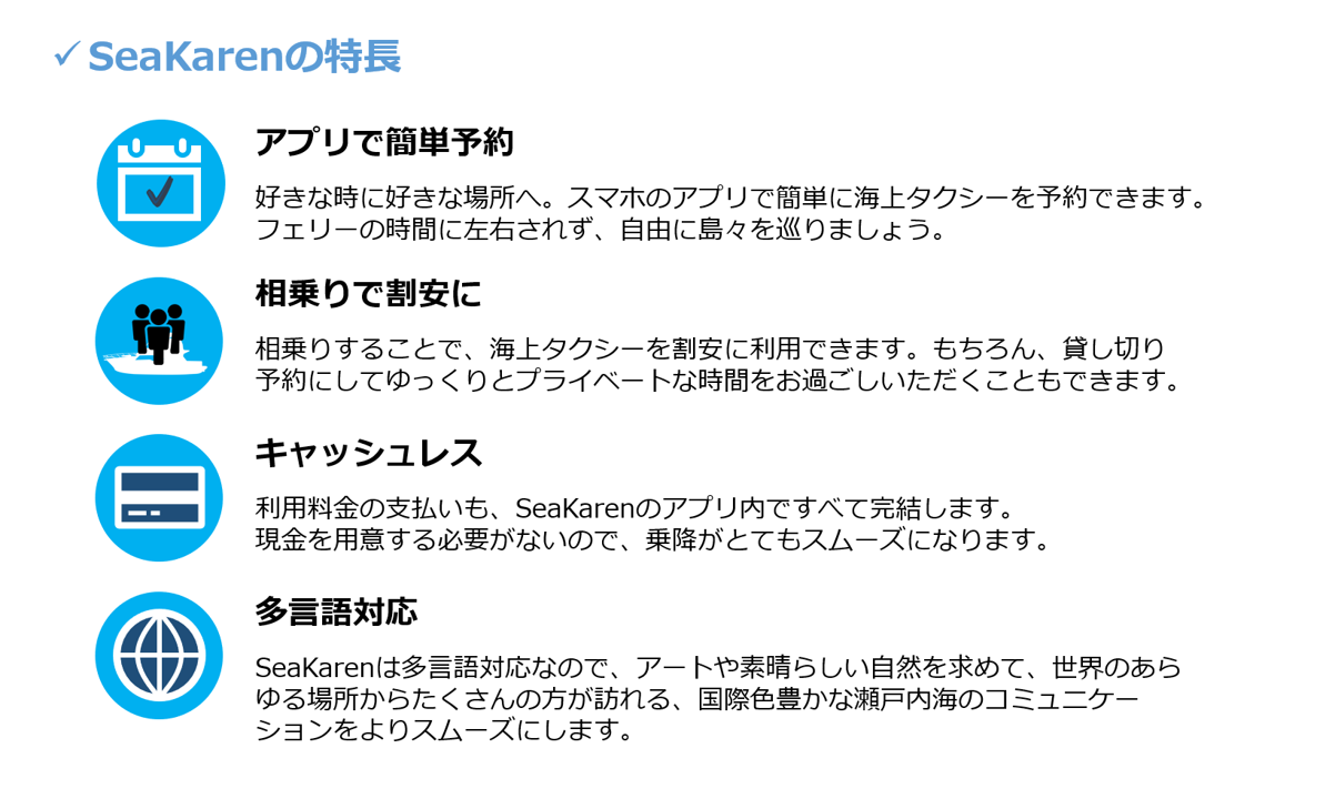 SeaKaren(シーカレン)は、「手のひらの上から船を呼ぼう 海の道を自在にゆく」をキャッチフレーズに、自身のスマートフォンやタブレット端末等にインストールした専用アプリ内で、海上タクシーの予約から相乗り募集、利用料金の決済まで、すべてが完結する海上タクシーと利用者とのマッチングサービスです。