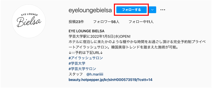 ①「EYE LOUNGE BIELSA」の公式Instagram( https://www.instagram.com/eyeloungebielsa/ )をフォロー
