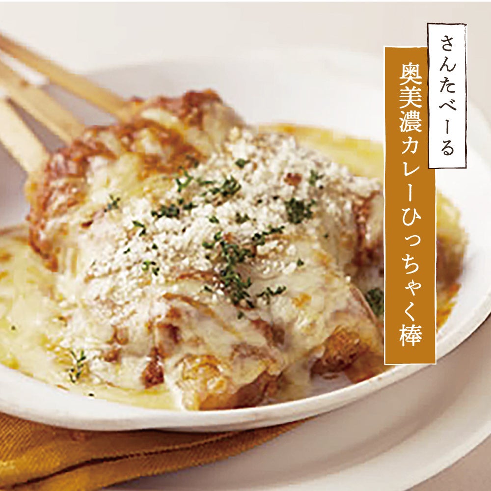 さんたべーるの「ひっちゃく棒」は「ひっちゃく(偶然に)」という方言のとおり、偶然生まれた新しいご当地フードです。奥美濃地鶏のつくねを味噌とカレーで味付けし、美濃ヘルシーポークで巻いて串に刺して焼き上げ、その上から奥美濃カレーをかけた一品。