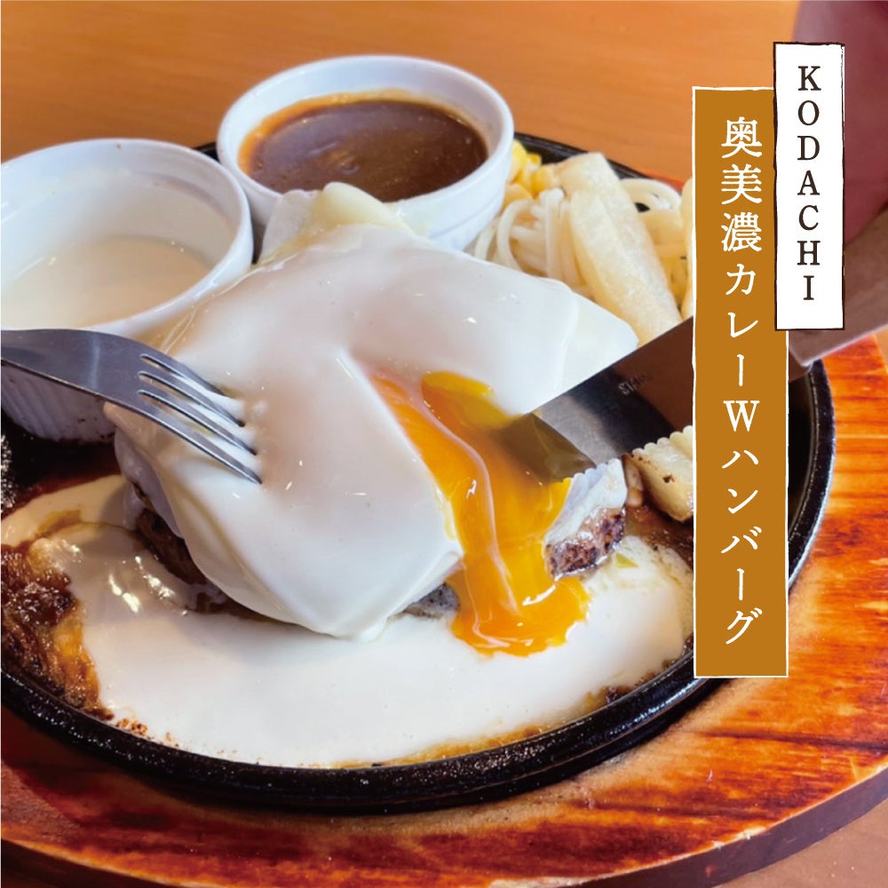 KODACHIの奥美濃カレーWハンバーグは、積み重ねたハンバーグの上に目玉焼き&チーズをトッピング。さらにその上からかかったチーズフォンデュソースが香りをいっそう引き立てます。カレーに絡めて食べれば天にも昇るおいしさです。
