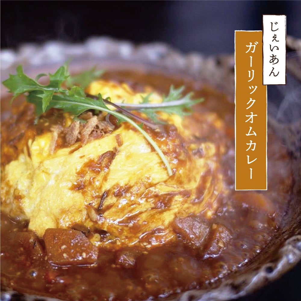 じぇいあんのガーリックオムカレーは、ニンニク好きにはたまらないカレー。ガーリックライスを卵で包んだオムライスに、奥美濃カレーを流し込んだ創作カレーです。熱々グツグツなのでやけどに注意してフーフーしながらお召し上がりください。