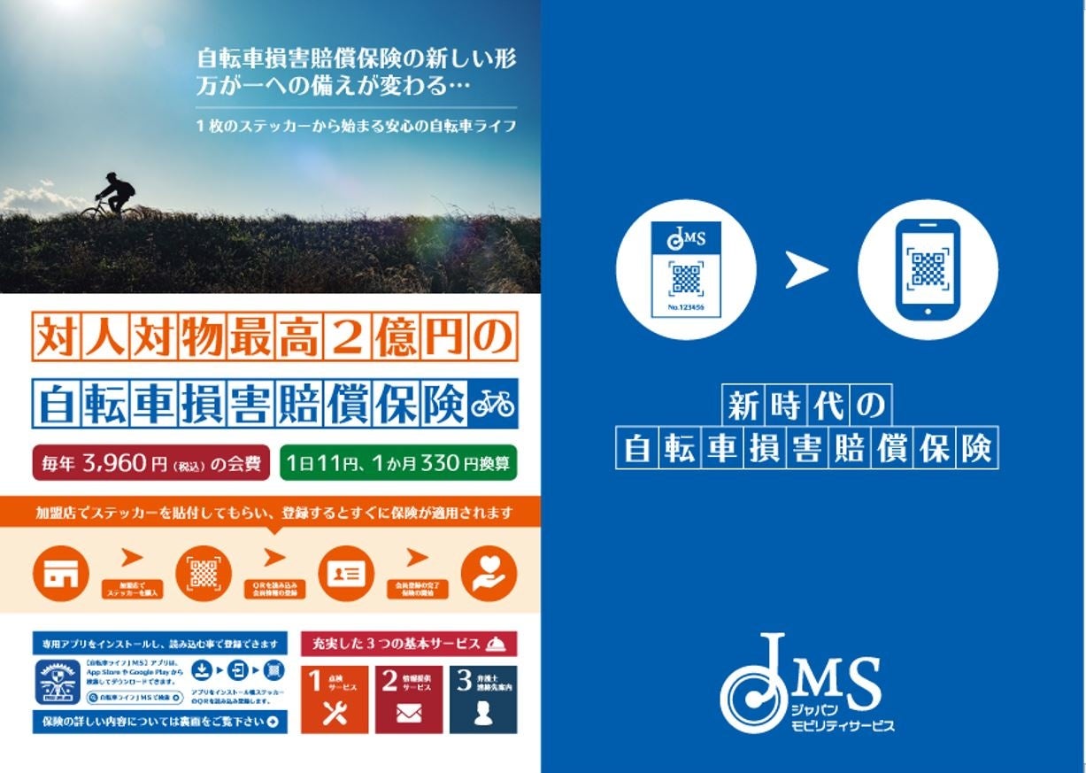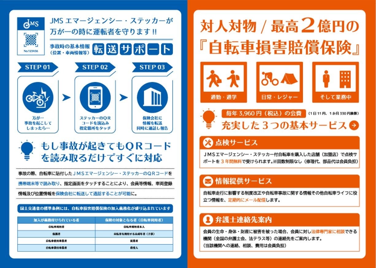 JMSは、「東京都/自転車の安全で適正な利用の促進に関する条例」に規定されている「点検整備」「自転車損害賠償保険」という自転車の安全安心の施策をパッケージした『自転車ライフサポートサービス』を開発しました。車両価格2万円(税抜)以上の自転車に、加盟店で『JMSエマージェンジー・ステッカー(年会費:税込3,960円)』を貼付することで、加盟店による「無料点検サービス」が提供され、さらに、当該自転車の運転者を被保険者とした対人対物共通で最高2億円の自転車損害賠償保険を3年間付帯します。