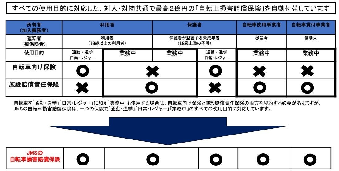 こうした問題を解決するため、JMSは、会員の使用目的に応じて、個人賠償責任保険と施設賠償責任保険の2つの保険に個別登録することに加え、自動車保険と同様に自転車という「車両」に保険を付帯することで、「日常・レジャー」「通勤・通学」そして「業務時間中」に使用する場合を含め、全ての自転車活用シーンにおける損害賠償責任に対応できるスキームを構築しました。