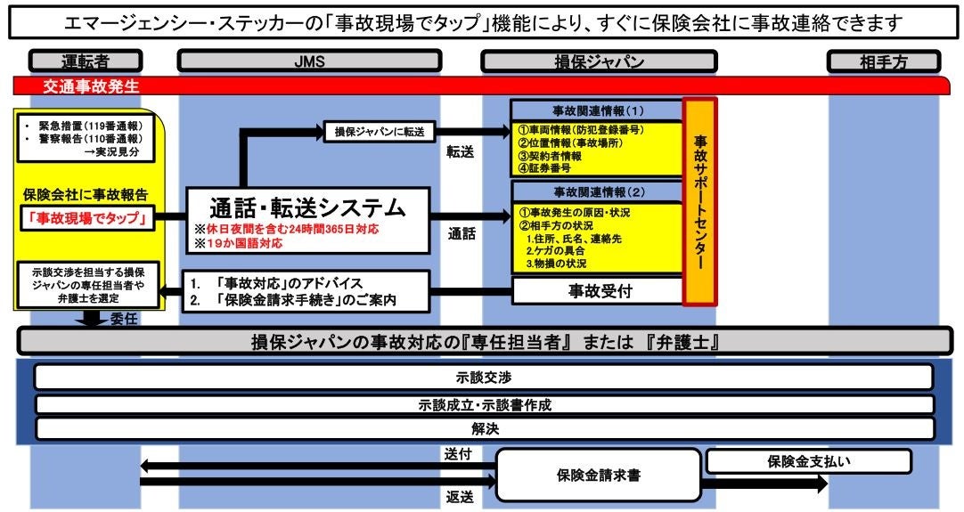 自転車運転中に交通事故に遭ったり起こしたりした時に、自転車に貼付されている『JMSエマージェンシー・ステッカー』のQRコードをスマートフォンで読み取り、事故報告画面の指定箇所をタップ(「事故現場でタップ」機能)することで、すぐに損害保険ジャパン株式会社(以下、損保ジャパン)の「事故サポートセンター」に休日夜間を含む24時間365日電話が繋がり、同時に車両情報、位置情報等がデータ転送されるため、速やかに「事故報告」が完了します。また、事故報告の際に損保ジャパンからのアドバイスを受けることも可能となります。これにより、事故を起こしても、「どこに電話すればいいかわからない」「自分が今どこにいるかわからない」「事故現場での対応の仕方がわからない」という運転者の不安が解消されることを目指します。