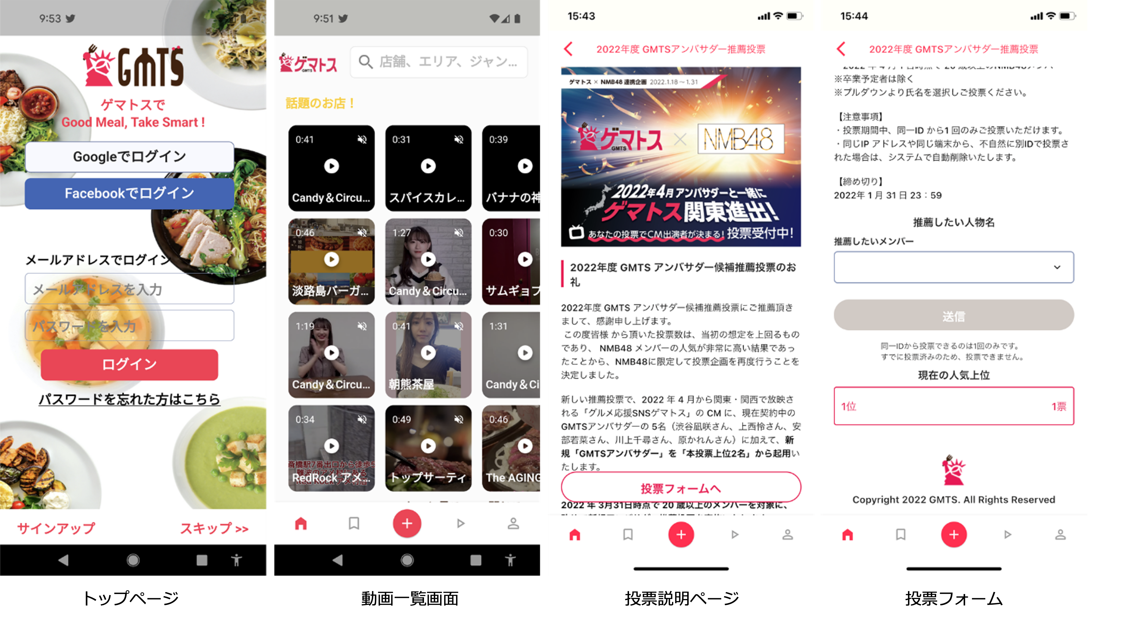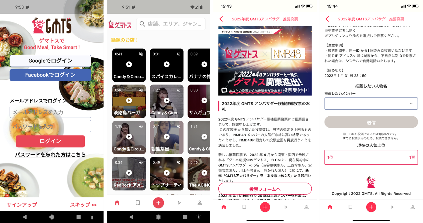グルメ応援SNS ゲマトスを提供する株式会社GMTS(本社:東京都台東区、代表取締役:橋本 英雄)では、4月以降に関東・関西圏で放映予定の新CMに出演する「GMTS公式アンバサダー」をゲマトスアプリユーザーからの投票上位2名で決定する「NMB48対象・新GMTSアンバサダー投票」を、2022年1月18日~1月31日23:59で実施いたします。