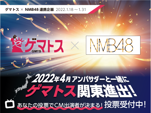 2022年4月からゲマトスのサービスを関東などの他エリアに拡大することに伴い、株式会社GMTSで、2021年12月28日からゲマトスアプリ内において、NMB48に限定することなく関東でも放送されるCMに出演する「次期アンバサダー推薦投票」をアプリユーザーを対象に実施したところ、当初の想定を上回る得票数があり、圧倒的に上位をNMB48のメンバー占めたことから、NMB48のみを対象として改めて投票を実施する運びとなりました。