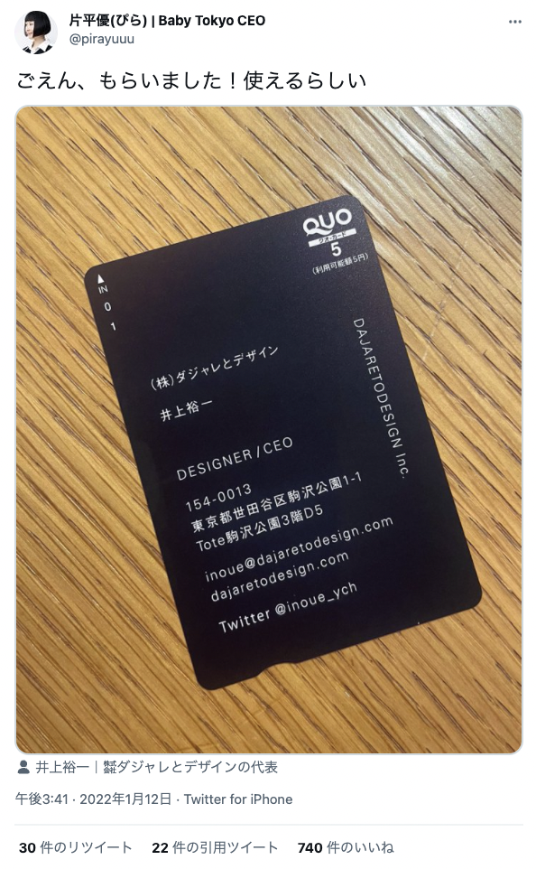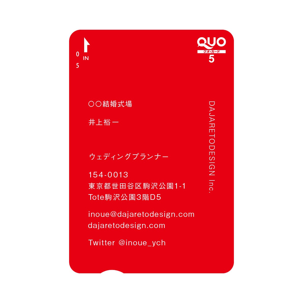 株式会社ダジャレとデザイン(本社:東京都世田谷区、代表取締役:井上裕一、以下「(株)ダジャレとデザイン」)が企画した、5円(ご縁)QUOカード名刺の受託制作サービスをはじめました。本サービスは、テレワークが進み「人とリアルに会う」こと自体が尊い時代に、もし直接お会いできたご縁があれば、そのご縁を5円のQUOカード名刺をプレゼントすることで、名刺交換を少し特別な記念にするサービスです。