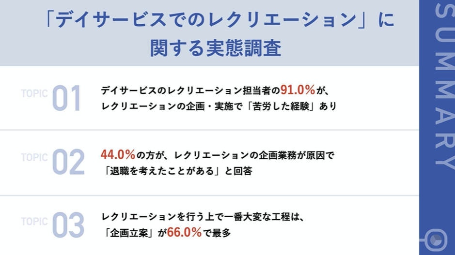 今回の調査では、デイサービスに勤務する方にとって、レクリエーションを企画することがかなりのプレッシャーとなっており、退職を検討するほど労力がかかる業務であることが浮き彫りになりました。要介護者にとって、ADL(日常生活の動作)とQOL(生活の質)を上げるためには、レクリエーションが重要であることは間違いないものの、コロナ禍の影響で、更に高度なレクリエーションを企画する必要に迫られている状況が、デイサービス勤務者の大きな負担となっている状況です。施設責任者は、レクリエーションの企画を勤務者に一任するのではなく、レクリエーション企画の知識を向上するための資格を取得したり、専門知識を提供する書籍やWebサイトからのサポートを取り入れるなども、介護の現場で働く人材を長期的に確保するための施策として有効と言えるかもしれません。