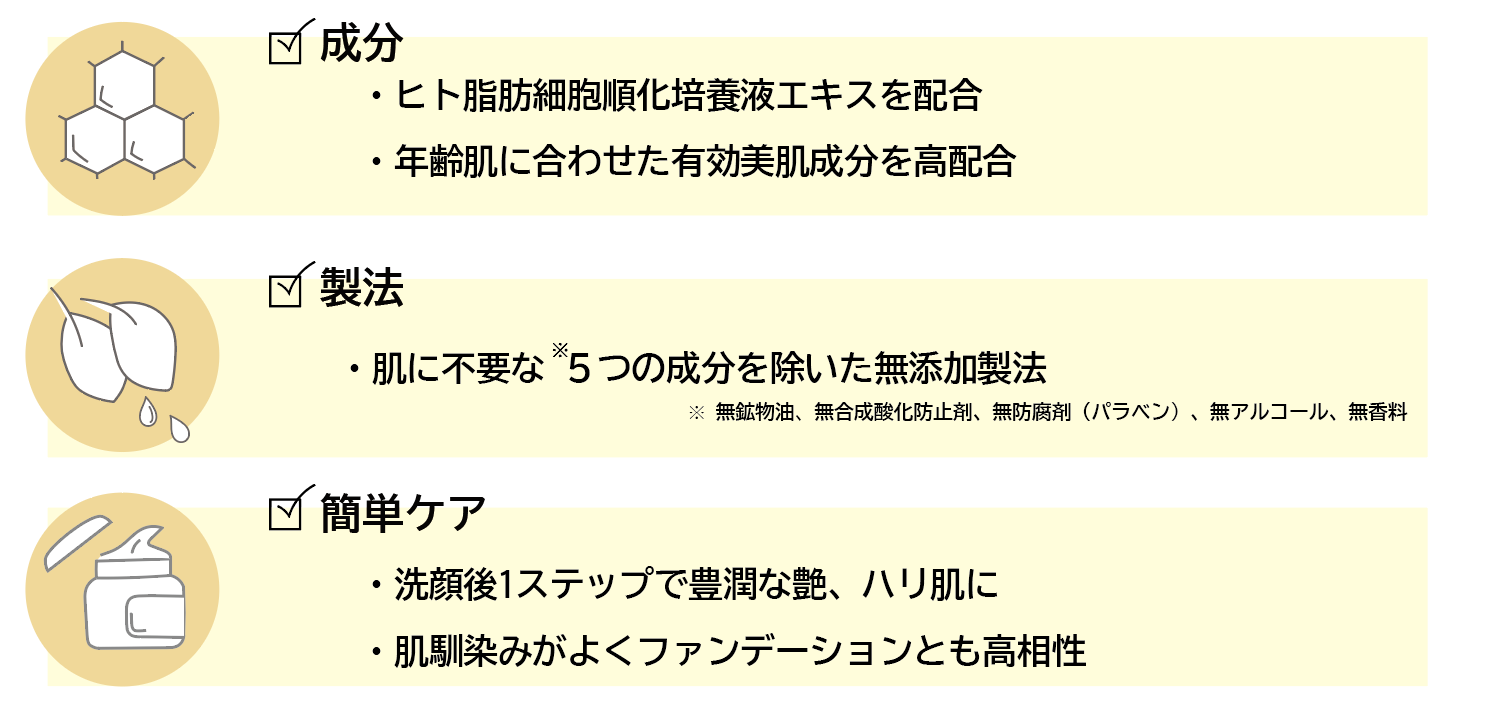 “成⻑因子”はヒト脂肪細胞順化培養液エキスにたっぷり含まれており、“保湿成分”はヒアルロン酸、“メラニン抑制成分”はナイアシンアミドなど、美容成分も贅沢に配合しながら、朝晩のクイックなワンステップスキンケアとして使用できるオールインワンジェルタイプに仕上げました。