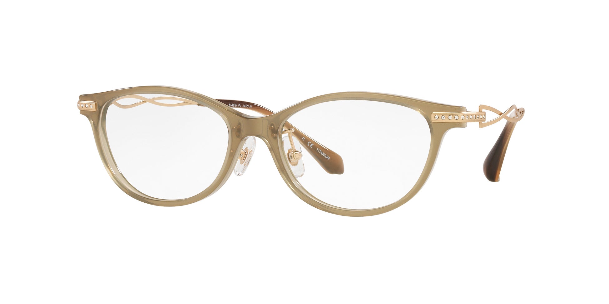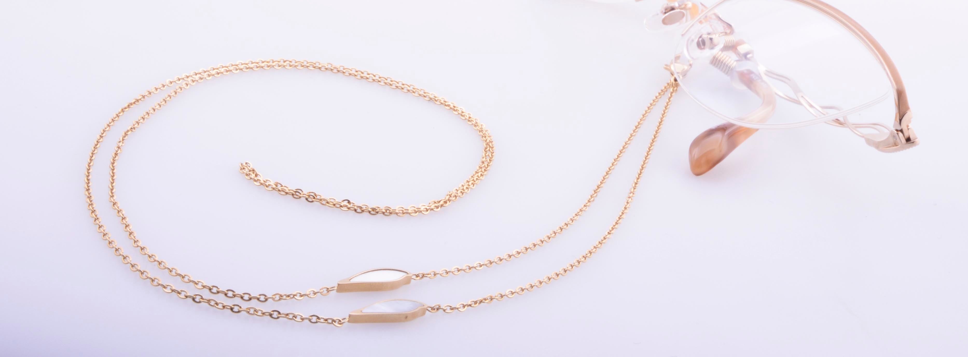 天然のマザーオブパールをあしらった高級ジュエリーフレーム。シリーズ初ラインナップのブローバースタイルは眉からテンプルにかけて流れるようなデザインが特徴。腕飾りに2個のマザーオブパール ×2配置、付属のグラスコードにも同じく2個配置。