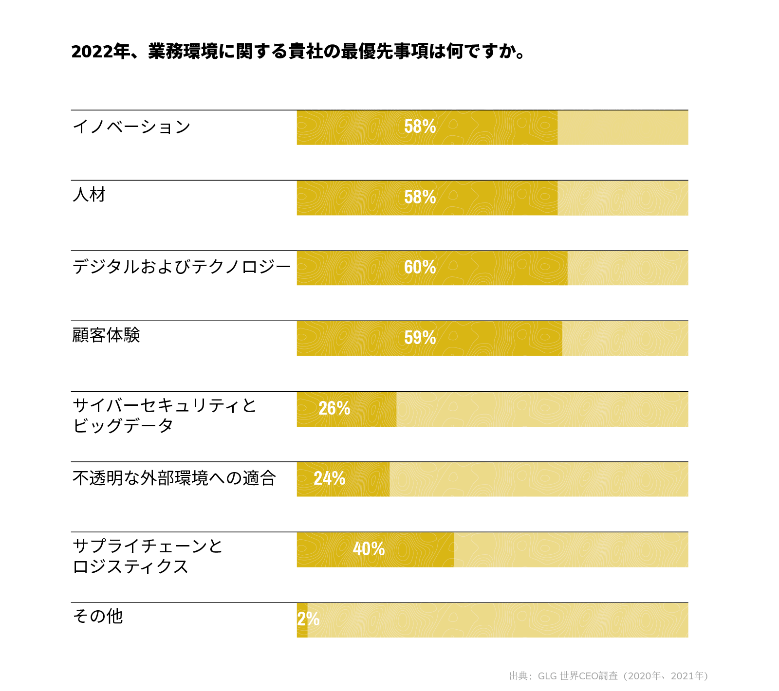 調査に参加したCEOは、2022年の最優先事項として「デジタルおよびテクノロジー」(60%)、「顧客体験」(59%)、「イノベーション」「人材」(同率58%)を挙げました。
