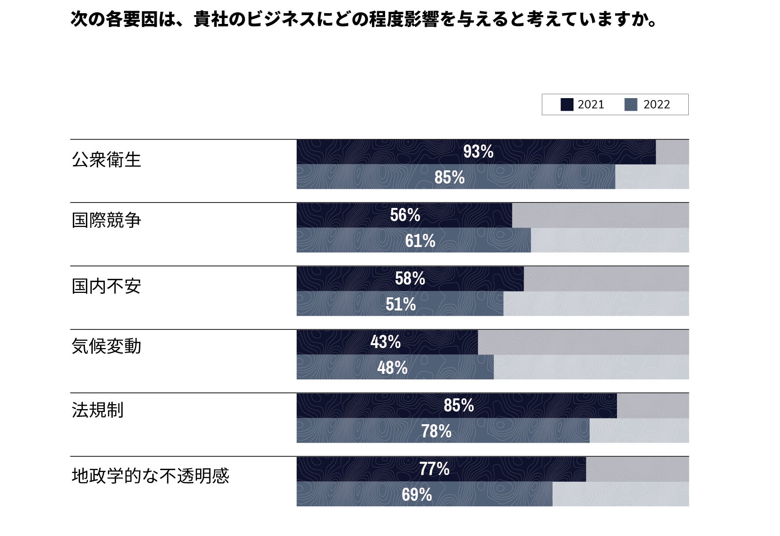 85% の回答者が最大の関心事として「公衆衛生」を挙げており、「法規制」(78%)、「地政学的な不透明感」(69%)が続きました。