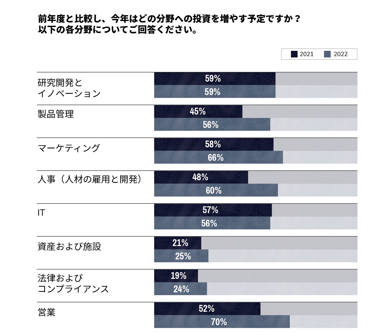 2022年に向けて投資を増やす分野として、調査に参加したCEOの多くが「営業」(70%)と「マーケティング」(66%)を挙げました。昨年の第1位は「研究開発とイノベーション」(59%)でした。