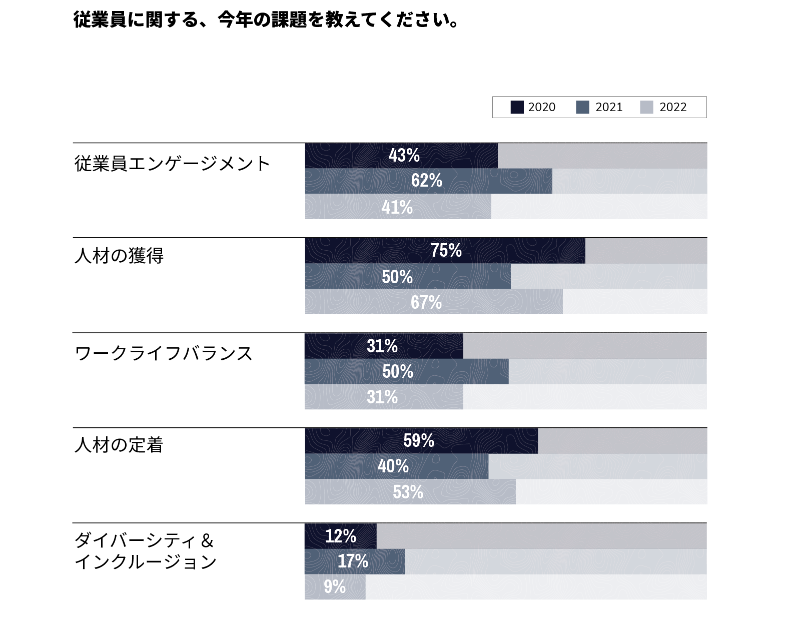 2020年の調査では、調査に参加したCEOの75%が従業員に関する最重要課題として「人材の獲得」を挙げていました。その後、新型コロナウイルス感染症の拡大を受けてその割合は50%に低下したものの、今年の調査では67%まで増加していました。