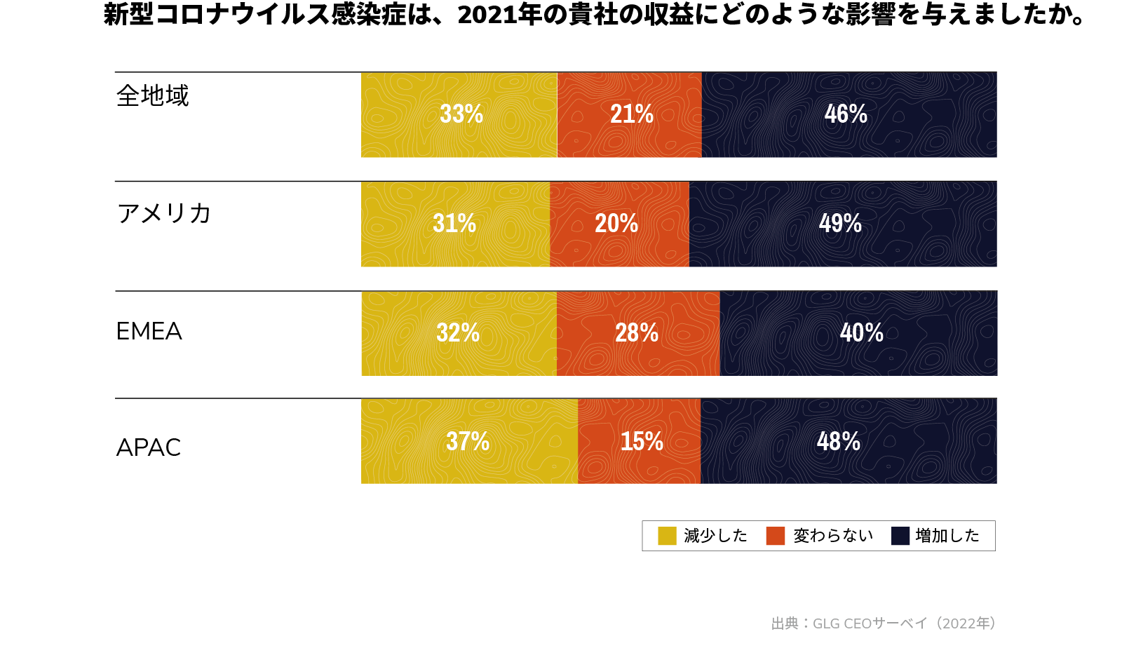 世界各国の471人のCEOに2021年の収益状況を尋ねたところ、46%が「増加した」、21%が「変わらない」、33%が「減少した」と回答しました。