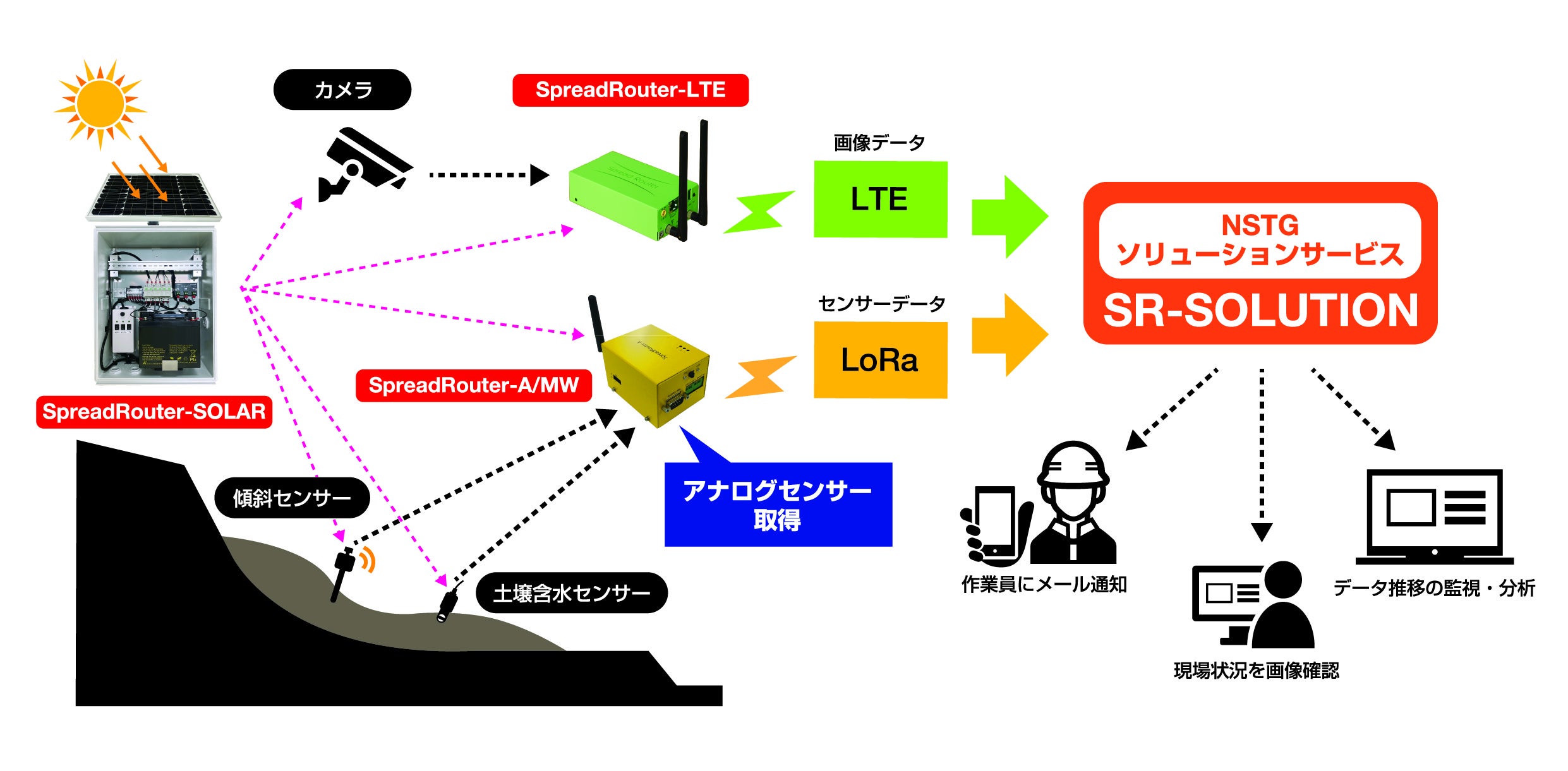 本システムでは、監視対象エリアに設置した各種センサーを広域LoRa無線で定期的にデータ取得することで現場状態の危険性を判断、異常値が計測された際には管理者へアラートメールを通知して点検作業の省力化と作業安全性の向上を図ることができます。また、センサーや通信機器には電源が必要ですが、太陽光電源装置「SpreadRouter-SOLAR」を利用することで解決を図ることが可能です。