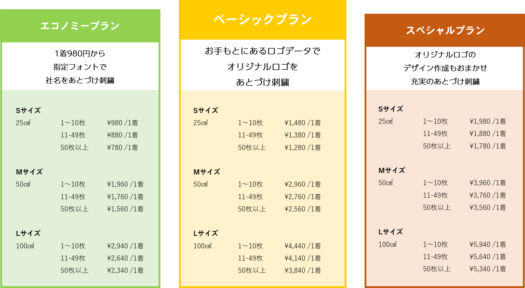 条件に合わせた3つのプランを用意。刺繍面積25㎠まで 1枚980円から