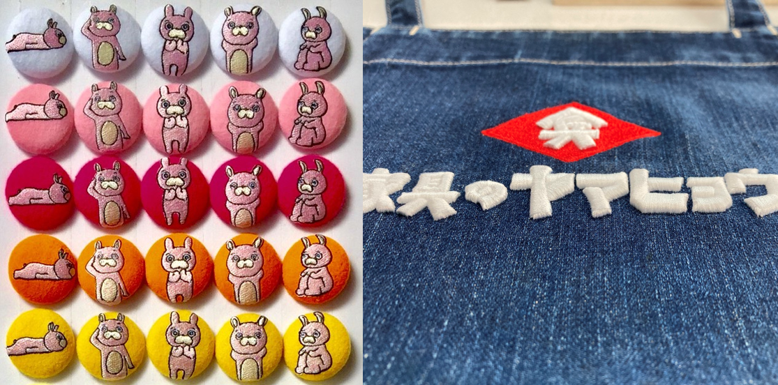 当社は、1988年に創業以来ニットやスリッパ等への刺繍を中心に、近年は高精密な刺繍技術を活かし山形県朝日町のゆるキャラ「うさひ」グッズの制作(左)や山形県内の企業ロゴを施したグッズや制服類(右)への刺繍を小ロットから対応しています。