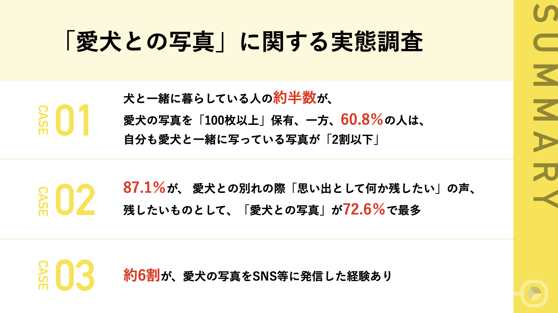 今回の調査では、コロナ禍で在宅の時間が増え、愛犬と過ごす時間も大切にしている人が増えたことが分かりました。一緒に暮らす愛犬との思い出として、「愛犬と一緒に写っている写真」を残したいと思いつつも、第三者の存在がないと撮れなかったり、そもそも犬の写真を写すことが難しいことも推察され、愛犬と一緒に写っている写真を所持している人が少ないことも明らかになりました。愛犬と一緒に写っているベストショットを思い出として残すために、プロのカメラマンに依頼することも有効かもしれません。