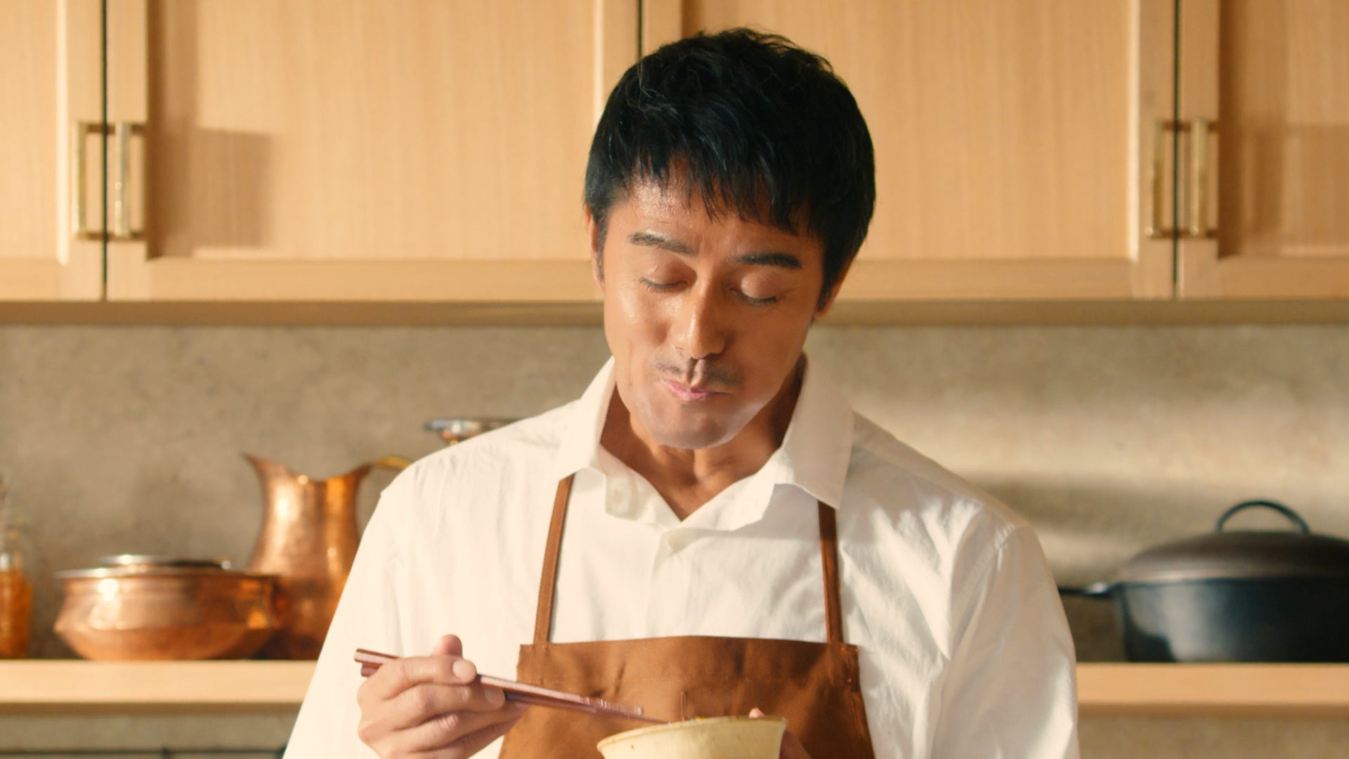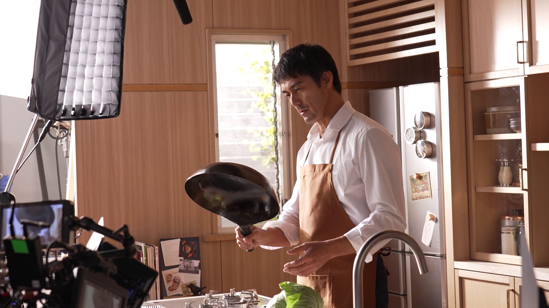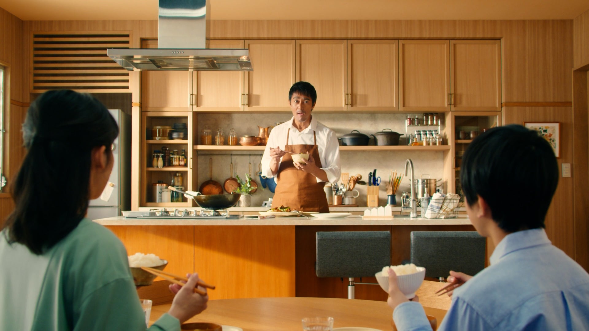 阿部寛さん演じるお父さんが、中華料理店で使われるような大きな中華鍋を使い、食材の切り方や炒め方など細部にまでこだわって料理に没頭するシーンから始まる本TVCM。豪快で巧みな鍋さばきも披露します。