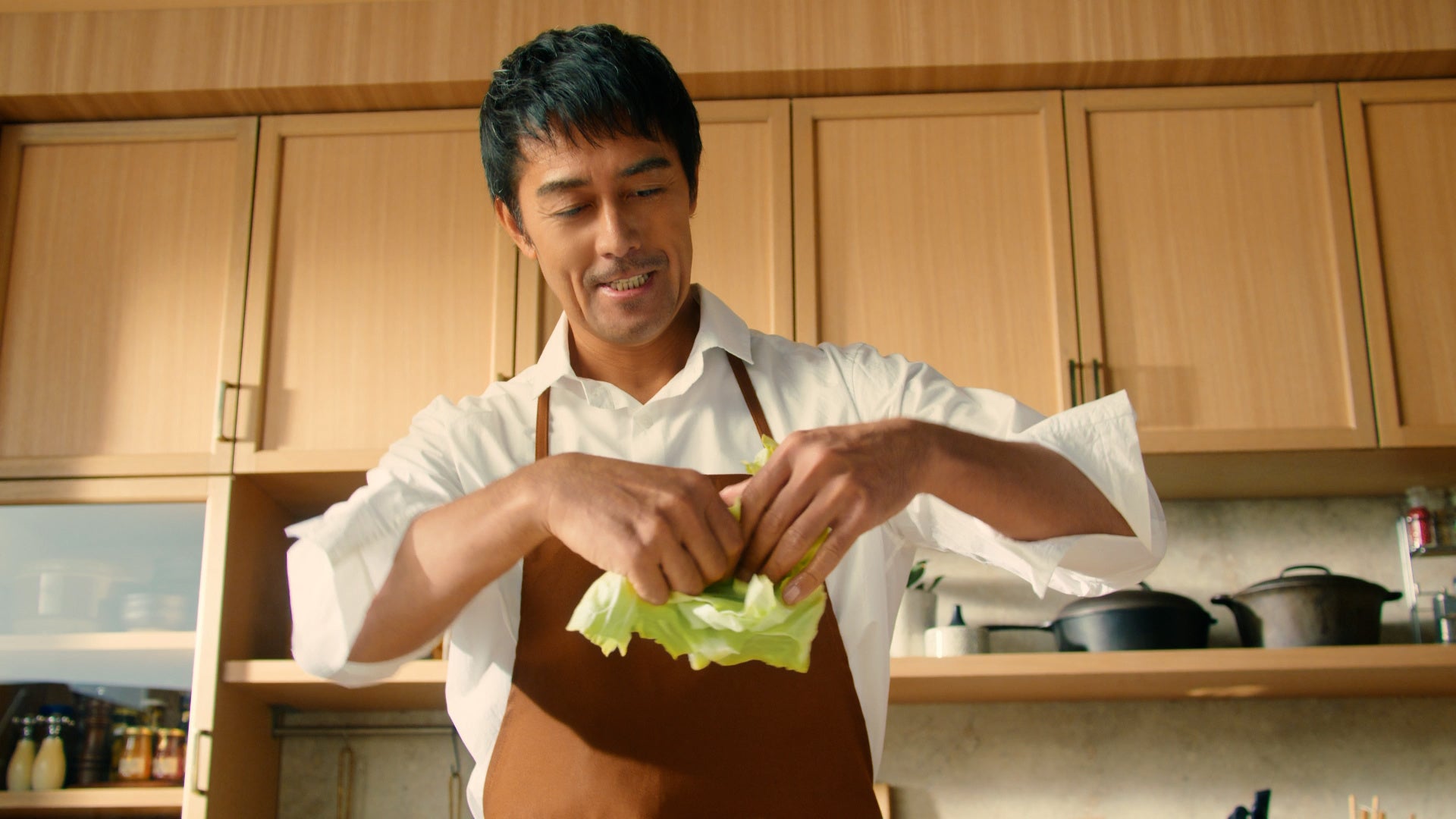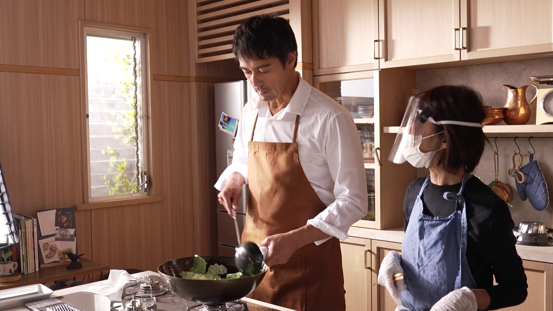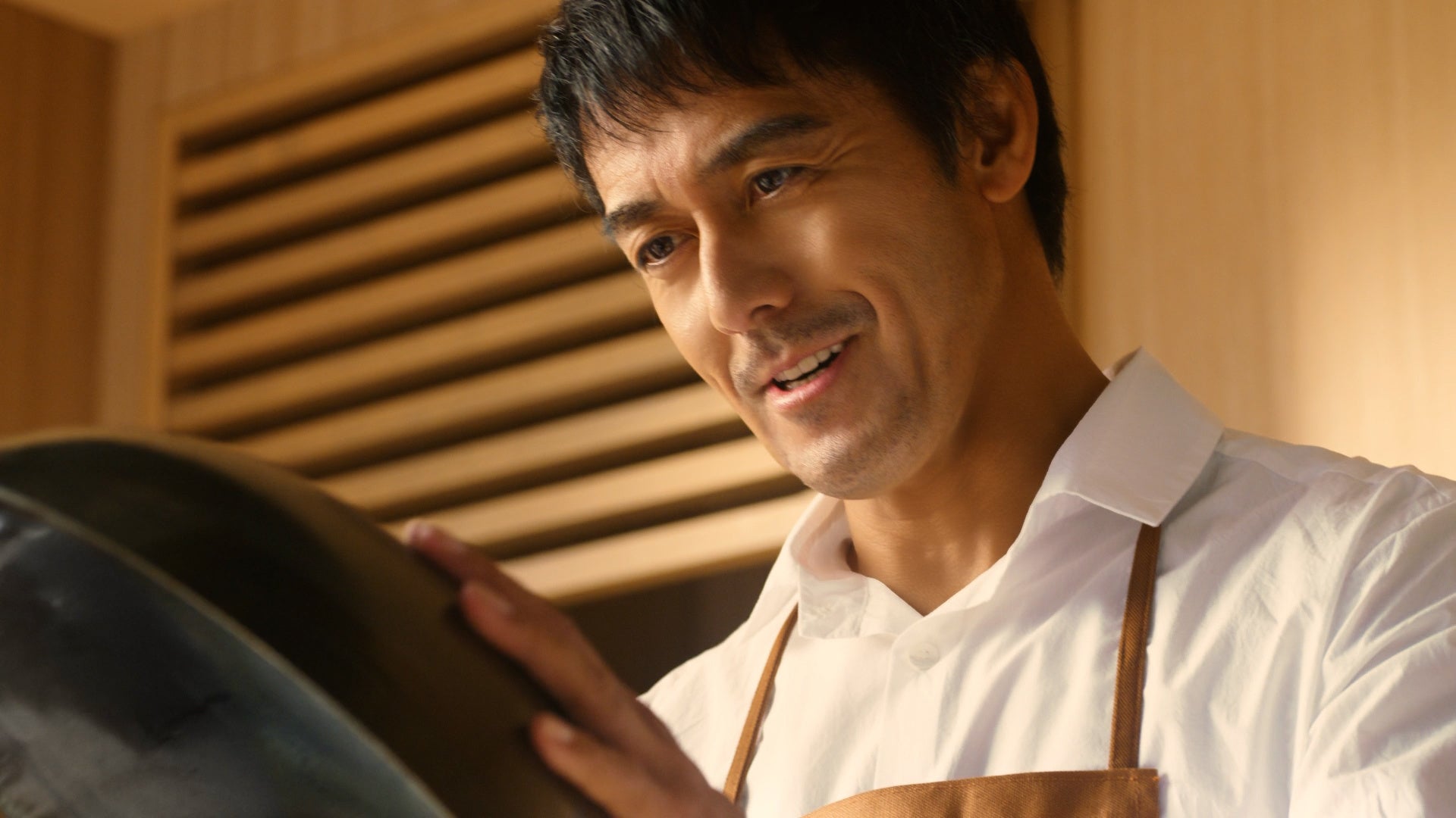 阿部寛さん演じるお父さんが、中華料理店で使われるような大きな中華鍋を使い、食材の切り方や炒め方など細部にまでこだわって料理に没頭するシーンから始まる本TVCM。豪快で巧みな鍋さばきも披露します。