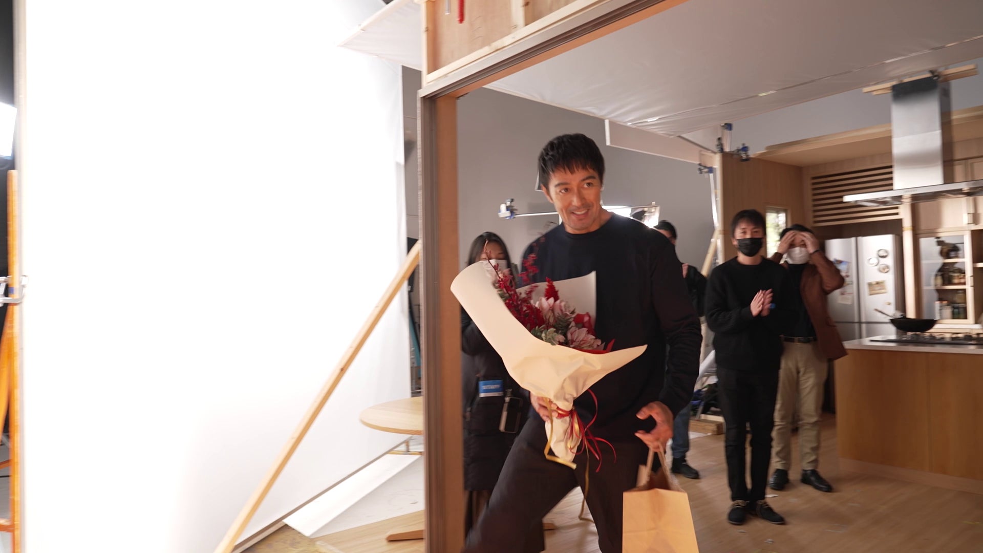 終始真剣な表情で撮影に望んでいた阿部寛さんでしたが、回鍋肉と麻婆茄子を食べるシーンではカットがかかると、思わず「うまっ」の声とともに表情が緩む場面もありました。回鍋肉をつまみ食いするシーンでは、口に入らない程の量を取ってしまい「入らねぇ(笑)」と思わず苦笑いをしたり、麻婆茄子をつまみ食いするシーンでは口に入れ切ることができず「だめでした(笑)」と困った表情を浮かべるなど、お茶目な一面を時折覗かせ和やかな雰囲気で撮影が進みました。最後はにこやかな表情で花束を受け取り、現場を後にしました。