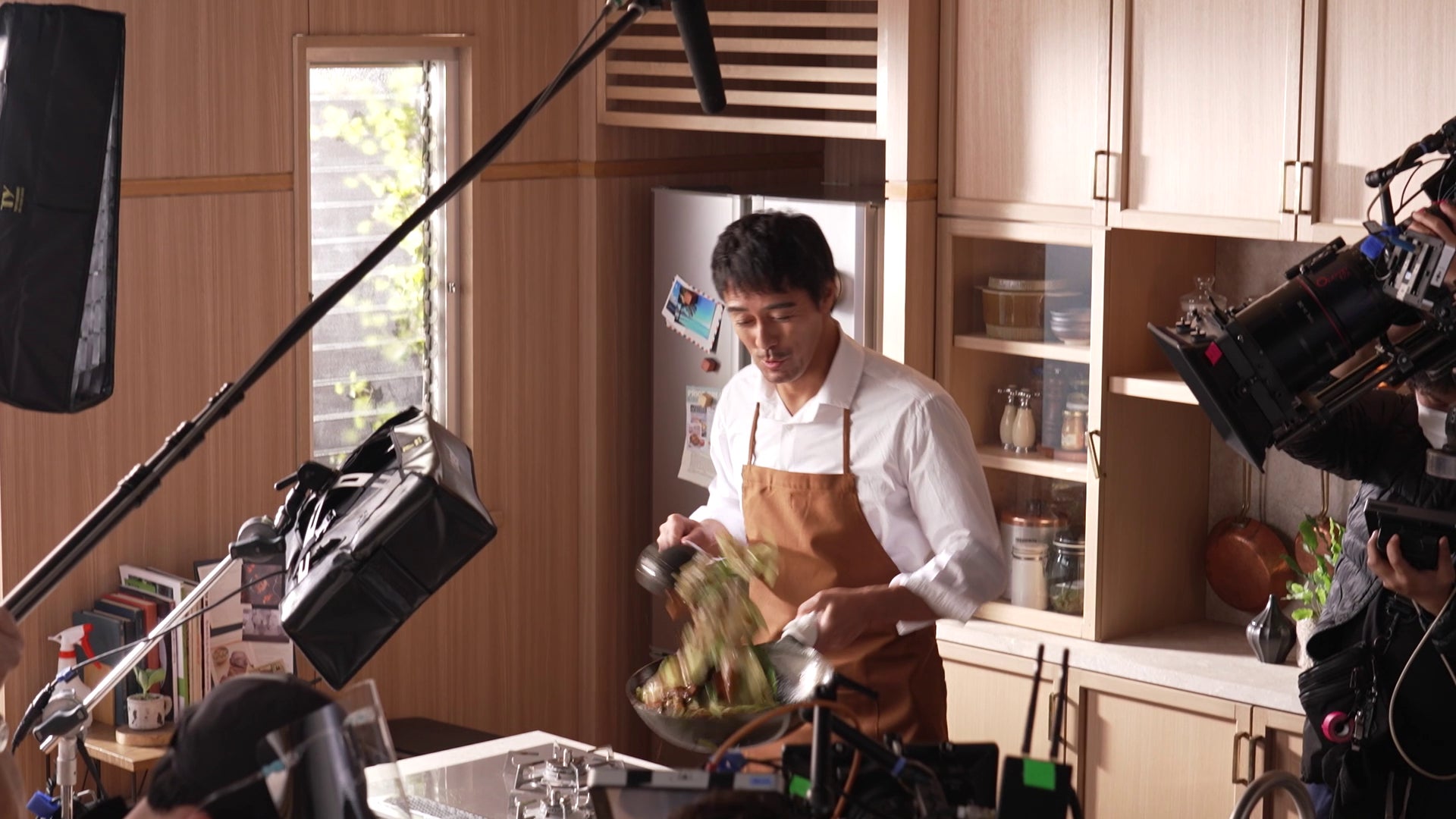 今回の撮影は阿部寛さんが回鍋肉を作るシーンからスタートしました。手でちぎったキャベツを鍋に入れるシーンでは、なかなか納得のいく形にならなかった阿部寛さんが、計5パターンものキャベツの入れ方を監督に提案。また撮影の合間にはスタッフから熱心に鍋のさばき方のレクチャーを受け、本番では華麗な鍋さばきを披露、スタッフから驚きの声があがる場面もありました。まさにクックドゥの製造工程と同じように、細部にまでこだわり抜いた演技で、撮影スタッフたちを唸らせました。