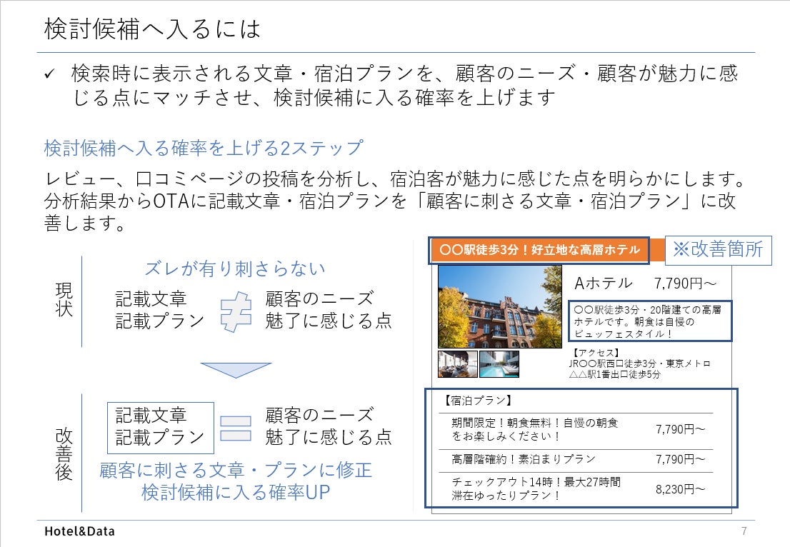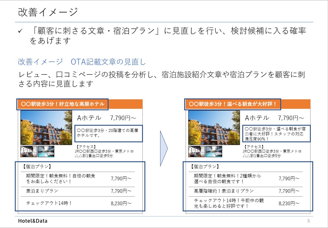 Hotel&Dataは①②を通じて「OTAサイト掲載宿泊プランの改善ご提案」等、具体的な集客増加施策立案のご提案及び実行支援を致します。