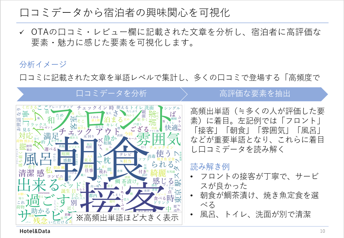下の図は「利用者が感じている魅力」の可視化の一例であり、投稿されたレビュー・口コミの中から、特に高頻出の単語ほど大きく表示されています。この例の場合「フロントの接客の質の高さ」「朝食の選択肢」が利用者に高評価であることが明らかになりました。しかしOTA上にて「〇〇駅徒歩5分」など立地の良さや、「素泊まりプラン」「レイトチェックアウトプラン」だけを推していてはこれら魅力は伝わりません。Hotel&Dataは「接客の質の高さ」「朝食の選択肢」も伝えることで、宿泊客増加に繋がると考えております。
