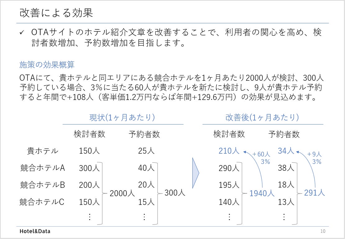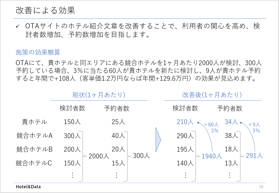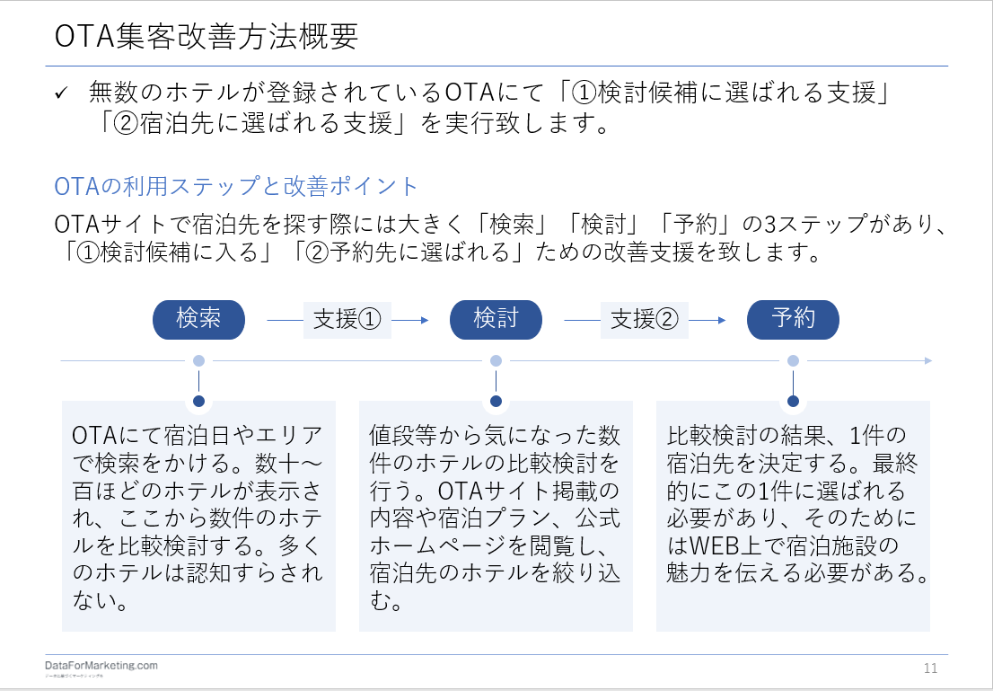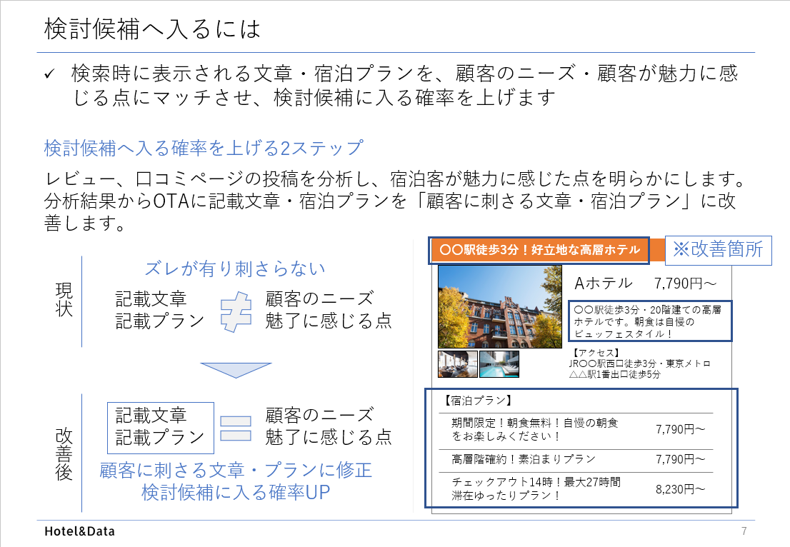 Hotel&DataはOTAに掲載する施設紹介文章や宿泊プラン、公式ホームページを改善することで「選ばれるホテル・旅館」になる支援を致します。