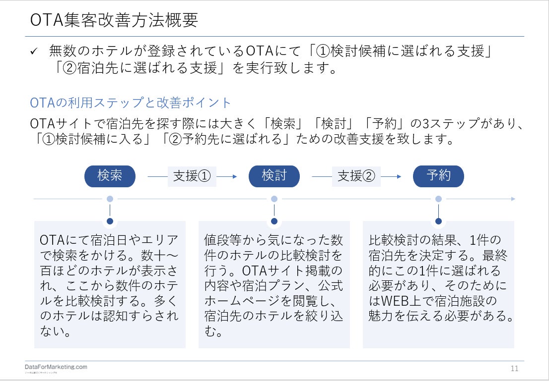 当サービスは「①無数に表示される検索結果から、検討候補に入れる確率を上げる支援」と「②検討候補の中から宿泊先として選択する確率を上げる支援」の大きく2ステップによって宿泊客増加を目指します。