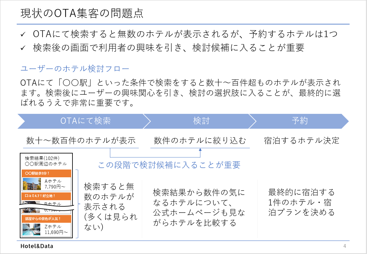 OTAには無数のホテル・旅館が登録されているものの、その多くは検討候補にすら選ばれないという問題があります。Hotel&Dataはこの問題に対処し「選ばれる宿泊施設」「予約される宿泊施設」となる支援サービスを提供致します。