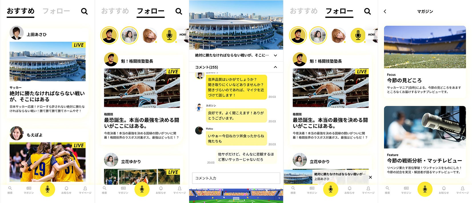 「I T」×「スポーツ」×「音声」でスポーツ観戦の新しいカタチを創出する実況観戦アプリです。会場で見るだけだったスポーツに実況・解説をつける事でよりスポーツを理解でき、チャット機能を使い更に一体感の生まれる観戦体験を提供します。