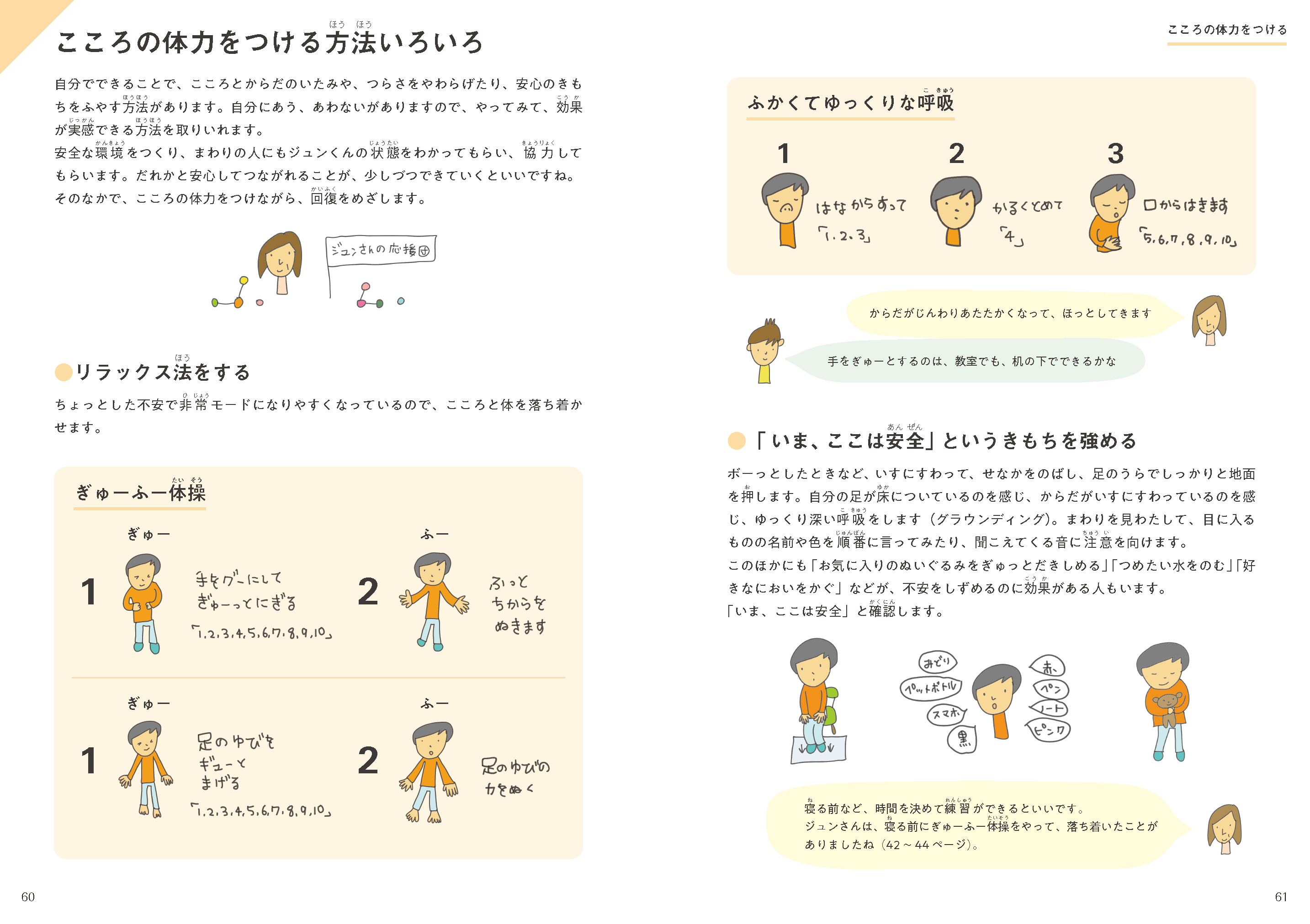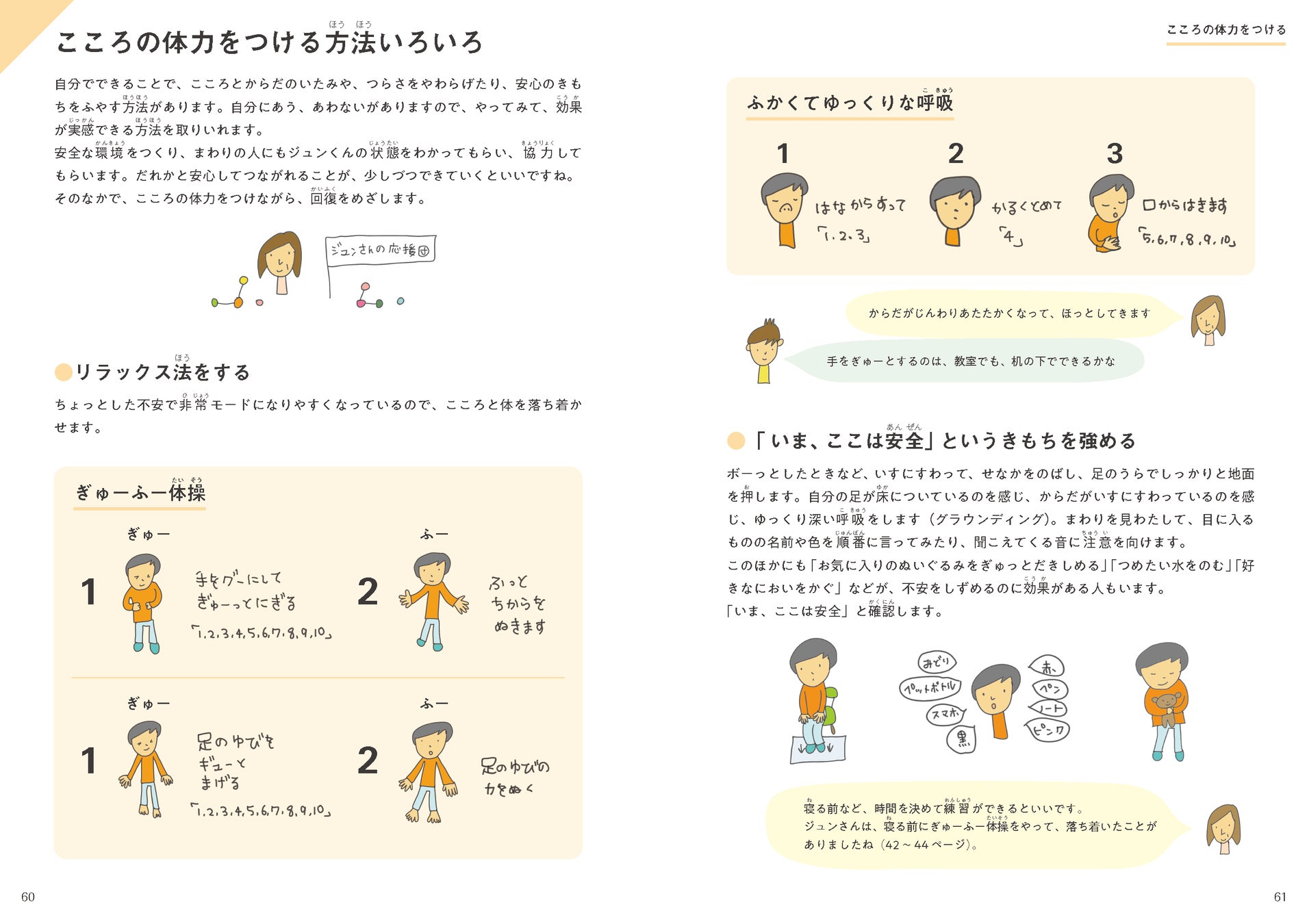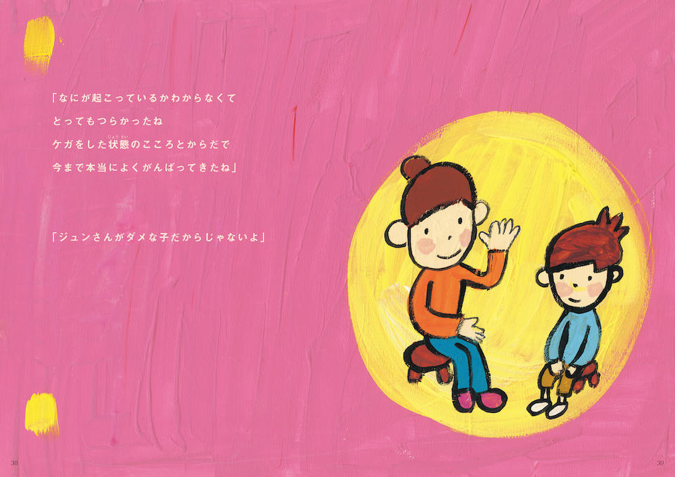 ジュンは先生と話すなかで、自分の状態が「こころのケガ」によるものだと知り、こころの体力をつける方法を試していくなかで少し元気を取りもどしていきます。