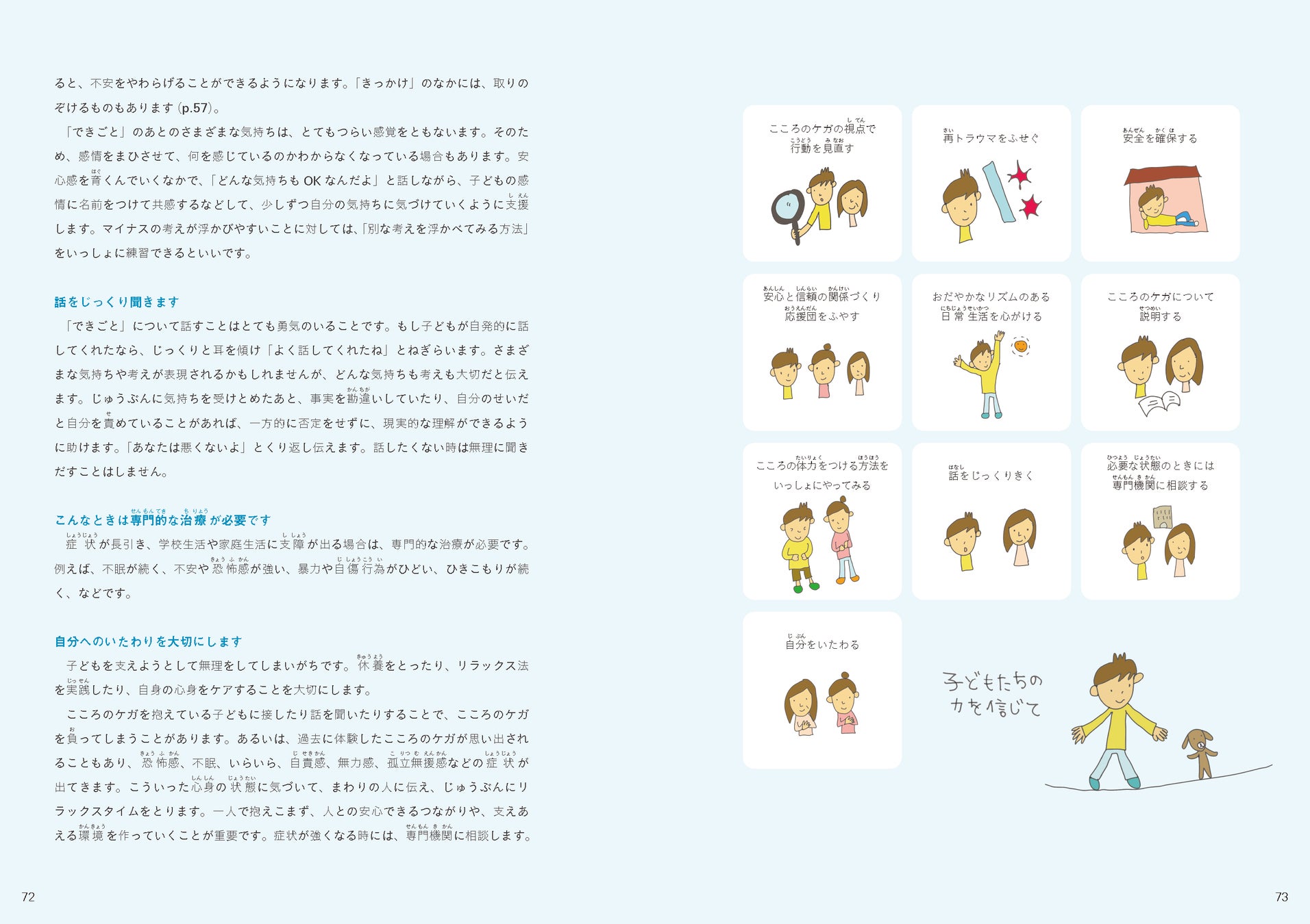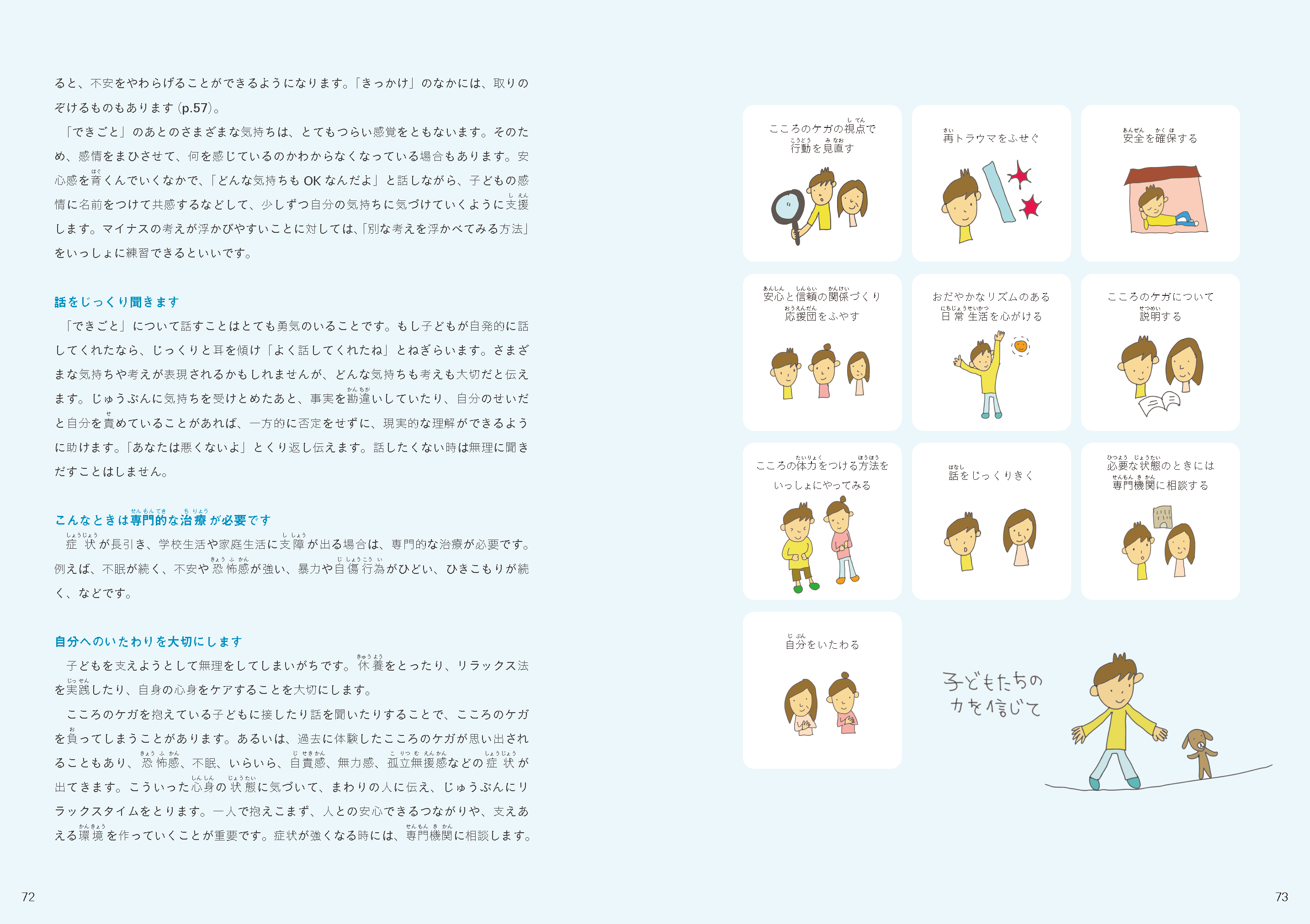 子どもをなるべく早い段階からサポートできるように、子どもと大人の両方へ働きかけられる構成で、この絵本をつくりました。