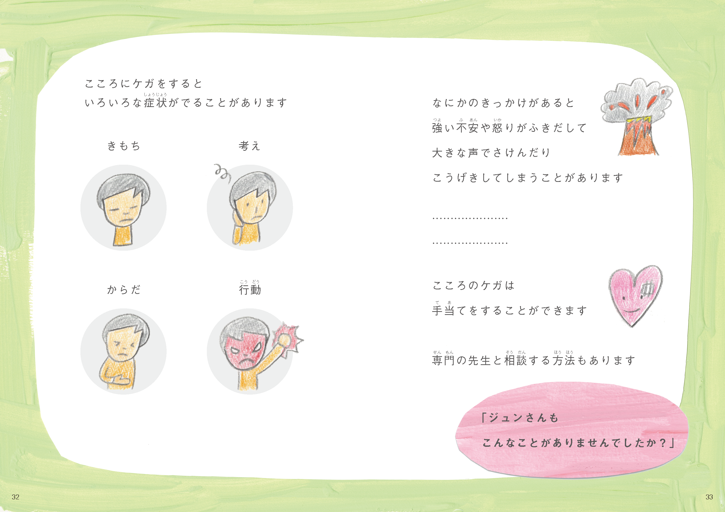 こういった背景をもとに、トラウマによる影響や対応方法を知り、トラウマがあるかもしれないという視点をもって、安全を重視して対応に取り組んでいく枠組み「トラウマ・インフォームド・ケア」の重要性が叫ばれるようになりました。近年、多くの本やリーフレット、情報がでていますが、日本オリジナルの絵本はまだわずかしかありませんでした。