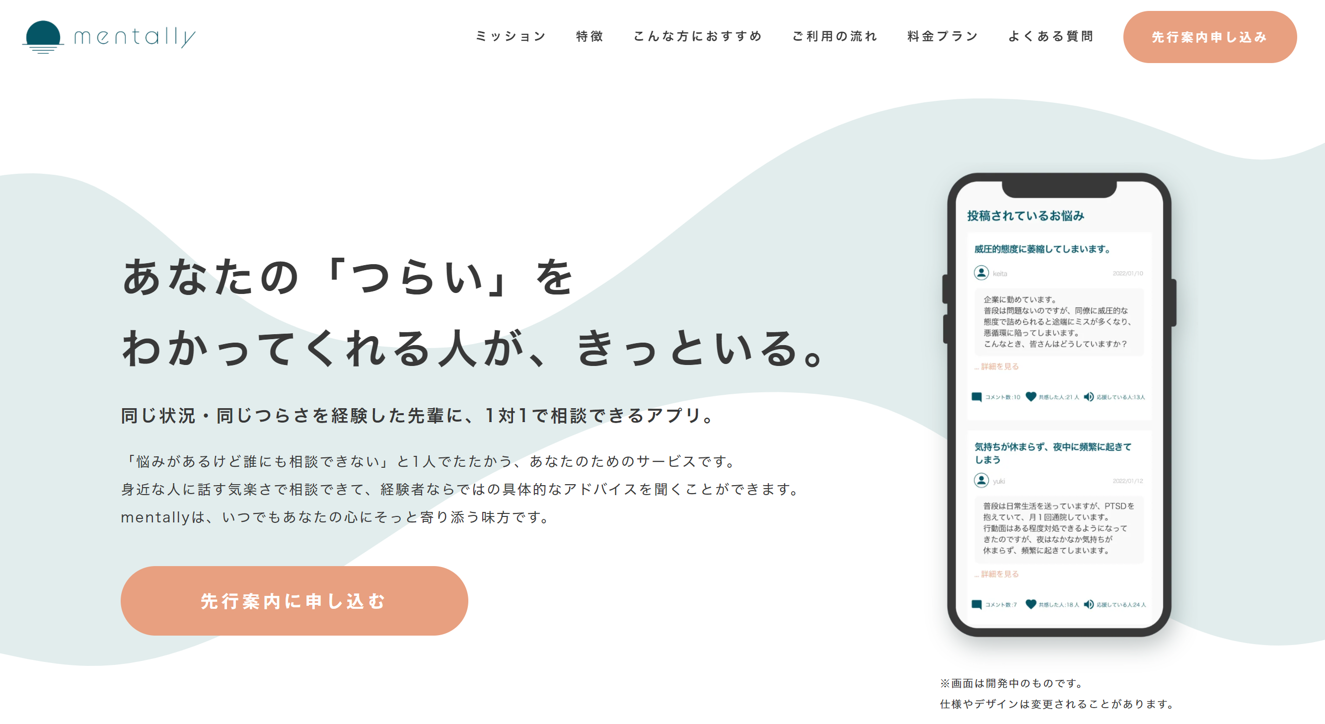 - 心の悩みを1対1で相談できるアプリ「mentally」、ティザーサイト公開と先行登録開始について