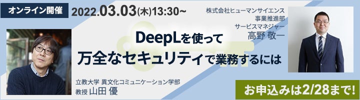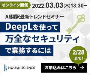 株式会社ヒューマンサイエンス(東京都新宿区西新宿2-7-1 代表取締役 熊沢剛)は、翻訳精度の高さで評判のDeepLやGoogle翻訳の活用法のセミナーを、2022年3月3日(木)に開催します。