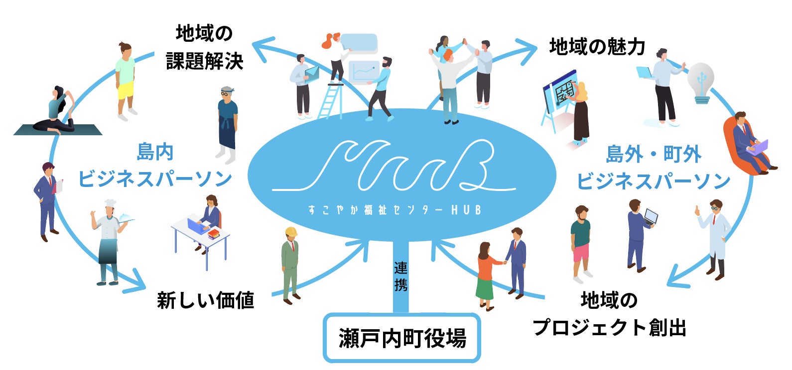 「すこやか福祉センター“HUB”」は環境資源が豊富な海の街、瀬戸内町の町役場と連携し、島外や町外から来島する施設利用者が地域の産業やコミュニティとの交流や地域に特化した様々なアクティビティから体験を得ることをベースに自らのスキルを活かし、新たな価値を創出していく働き方を総称し、Work+fullness=”ワークフルネス”と定義しています。