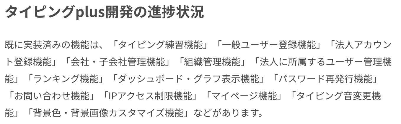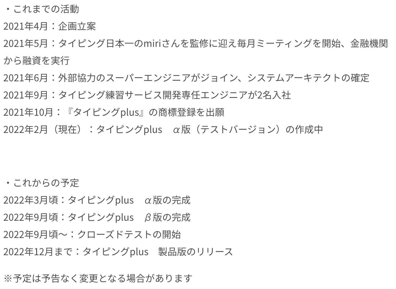 タイピング練習ができるクラウドサービスの『タイピングplus(商標登録出願済み)』は、2021年4月に企画立案して金融機関から資金調達し、2021年9月に2人の開発専任エンジニアを雇用して本格的に開発開始しました。2022年9月以降でクローズドテストを行い、2022年12月末までのリリースを予定しています。