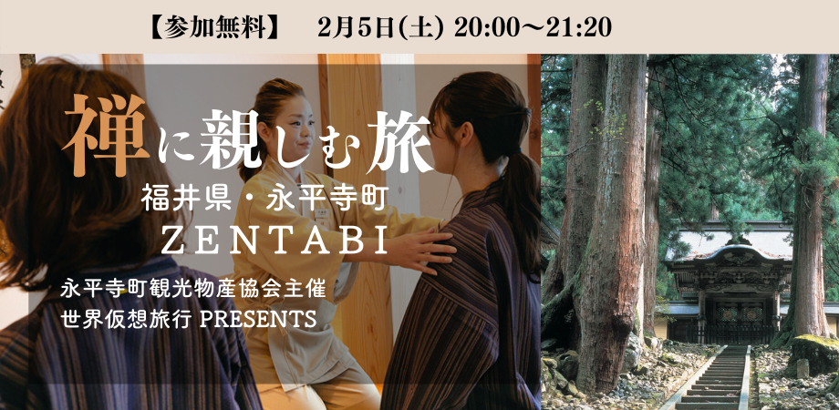 累計参加者1.5万人を越えるオンラインツアー事業「世界仮想旅行社」を運営するデクスター合同会社(本社:東京都品川区、代表社員:武川しのぶ、以下「デクスター」)は、永平寺町観光物産協会主催(本社:福井県吉田郡、以下「観光物産協会」)によるオンラインイベント「禅に親しむ旅〜永平寺・ZENTABIへ」を2月5日(土)20時00分よりZoomにて参加費無料で開催致します。