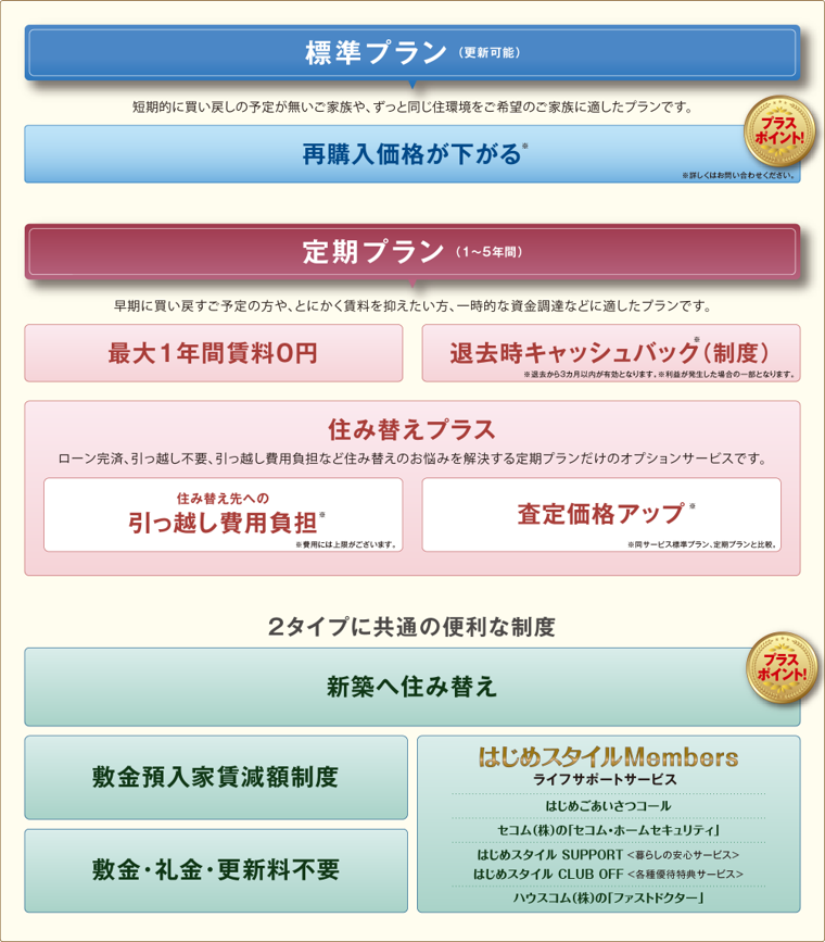 「リースバックプラス+」は、賃貸契約更新ができる「標準プラン」と、期間を定める「定期プラン」の2タイプをご用意。「標準プラン」では、将来ご自宅を買い戻す際の設定価格から、経年による建物価値減少分を差し引くシステムを導入。「定期プラン」でも、最大1年間の賃料を0円とし、売却金のうち不要な資金をお預けいただくことで賃料が減額できるなど、さまざまなニーズにお応えする制度を導入しています。